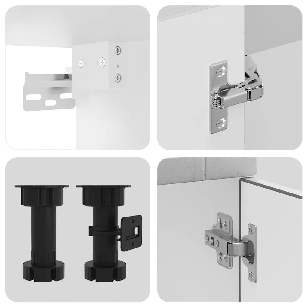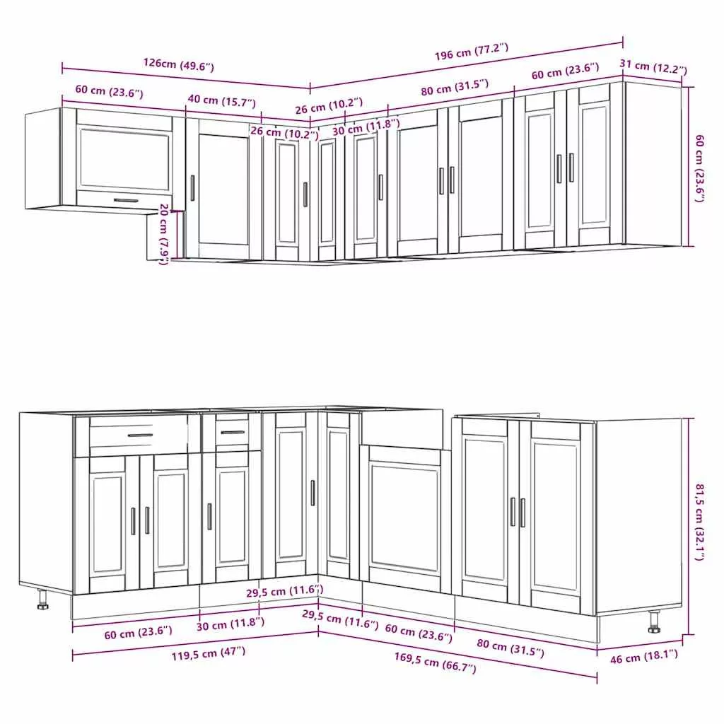 Ez az elegáns kialakítású, tizenegy részes konyhai szekrénygarnitúra optimalizálja konyhája terét, és bőséges tárolóhelyet biztosít személyes tárgyainak! Stabil és tartós anyag: A szerelt fa tartós és stabil anyag sima felülettel, amely ellenáll a nedvességnek, a vetemedésnek és a hasadásnak, így megbízható választás különféle célokhoz.Bőséges tárolóhely: A konyhaszekrénykészlet számos rekesszel rendelkezik, és elegendő helyet kínál tálak, tányérok, edények és egyéb konyhai eszközök tárolására.Állítható lábak: Az alsó szekrények állítható lábakkal rendelkeznek, amelyek magassága a konyha elrendezésének megfelelően állítható.Könnyen karbantartható: A sima felületnek köszönhetően ezek a konyhaszekrények könnyen tisztíthatók nedves ruhával, és kevesebb karbantartást igényelnek. Figyelem:A felborulás elkerülése érdekében ezt a terméket a mellékelt fali rögzítőeszközzel kell használni. Jó tudni:A falon belüli csavar(ok) és dugó(k) nem alaptartozékok. Keressen és használjon a falának megfelelő csavar(oka)t és dugó(ka)t. Ha bizonytalan, kérje szakember tanácsát. Gondosan olvassa el és kövesse a használati utasítás minden lépését.A munkalap, a mosogató és a csaptelep nem tartozéka a szállításnak.