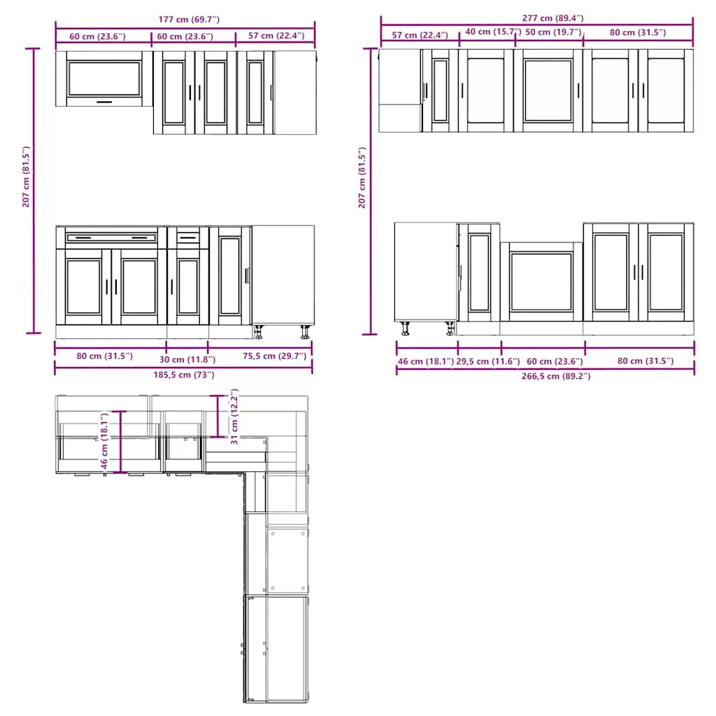 Ez az elegáns kialakítású, tizenegy részes konyhai szekrénygarnitúra optimalizálja konyhája terét, és bőséges tárolóhelyet biztosít személyes tárgyainak! Stabil és tartós anyag: A szerelt fa tartós és stabil anyag sima felülettel, amely ellenáll a nedvességnek, a vetemedésnek és a hasadásnak, így megbízható választás különféle célokhoz.Bőséges tárolóhely: A konyhaszekrénykészlet számos rekesszel rendelkezik, és elegendő helyet kínál tálak, tányérok, edények és egyéb konyhai eszközök tárolására.Állítható lábak: Az alsó szekrények állítható lábakkal rendelkeznek, amelyek magassága a konyha elrendezésének megfelelően állítható.Könnyen karbantartható: A sima felületnek köszönhetően ezek a konyhaszekrények könnyen tisztíthatók nedves ruhával, és kevesebb karbantartást igényelnek. Figyelem:A felborulás elkerülése érdekében ezt a terméket a mellékelt fali rögzítőeszközzel kell használni. Jó tudni:A falon belüli csavar(ok) és dugó(k) nem alaptartozékok. Keressen és használjon a falának megfelelő csavar(oka)t és dugó(ka)t. Ha bizonytalan, kérje szakember tanácsát. Gondosan olvassa el és kövesse a használati utasítás minden lépését.A munkalap, a mosogató és a csaptelep nem tartozéka a szállításnak.