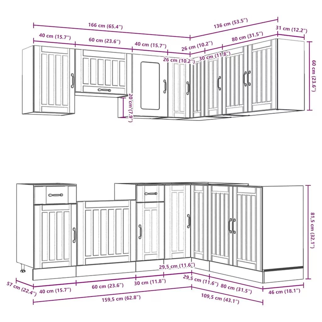 Ez az elegáns kialakítású, tizenegy részes konyhai szekrénygarnitúra optimalizálja konyhája terét, és bőséges tárolóhelyet biztosít személyes tárgyainak! Stabil és tartós anyag: A szerelt fa tartós és stabil anyag sima felülettel, amely ellenáll a nedvességnek, a vetemedésnek és a hasadásnak, így megbízható választás különféle célokhoz.Bőséges tárolóhely: A konyhaszekrénykészlet számos rekesszel rendelkezik, és elegendő helyet kínál tálak, tányérok, edények és egyéb konyhai eszközök tárolására.Állítható lábak: Az alsó szekrények állítható lábakkal rendelkeznek, amelyek magassága a konyha elrendezésének megfelelően állítható.Könnyen karbantartható: A sima felületnek köszönhetően ezek a konyhaszekrények könnyen tisztíthatók nedves ruhával, és kevesebb karbantartást igényelnek. Figyelem:A felborulás elkerülése érdekében ezt a terméket a mellékelt fali rögzítőeszközzel kell használni. Jó tudni:A falon belüli csavar(ok) és dugó(k) nem alaptartozékok. Keressen és használjon a falának megfelelő csavar(oka)t és dugó(ka)t. Ha bizonytalan, kérje szakember tanácsát. Gondosan olvassa el és kövesse a használati utasítás minden lépését.A munkalap, a mosogató és a csaptelep nem tartozéka a szállításnak.