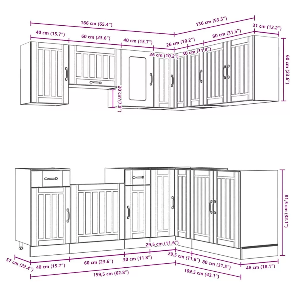 Ez az elegáns kialakítású, tizenegy részes konyhai szekrénygarnitúra optimalizálja konyhája terét, és bőséges tárolóhelyet biztosít személyes tárgyainak! Stabil és tartós anyag: A szerelt fa tartós és stabil anyag sima felülettel, amely ellenáll a nedvességnek, a vetemedésnek és a hasadásnak, így megbízható választás különféle célokhoz.Bőséges tárolóhely: A konyhaszekrénykészlet számos rekesszel rendelkezik, és elegendő helyet kínál tálak, tányérok, edények és egyéb konyhai eszközök tárolására.Állítható lábak: Az alsó szekrények állítható lábakkal rendelkeznek, amelyek magassága a konyha elrendezésének megfelelően állítható.Könnyen karbantartható: A sima felületnek köszönhetően ezek a konyhaszekrények könnyen tisztíthatók nedves ruhával, és kevesebb karbantartást igényelnek. Figyelem:A felborulás elkerülése érdekében ezt a terméket a mellékelt fali rögzítőeszközzel kell használni. Jó tudni:A falon belüli csavar(ok) és dugó(k) nem alaptartozékok. Keressen és használjon a falának megfelelő csavar(oka)t és dugó(ka)t. Ha bizonytalan, kérje szakember tanácsát. Gondosan olvassa el és kövesse a használati utasítás minden lépését.A munkalap, a mosogató és a csaptelep nem tartozéka a szállításnak.
