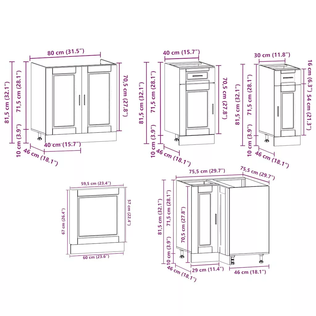 • 1 x konyhai sarokszekrény: 75,5 x 75,5 x 81,5 cm (Sz x D x K)