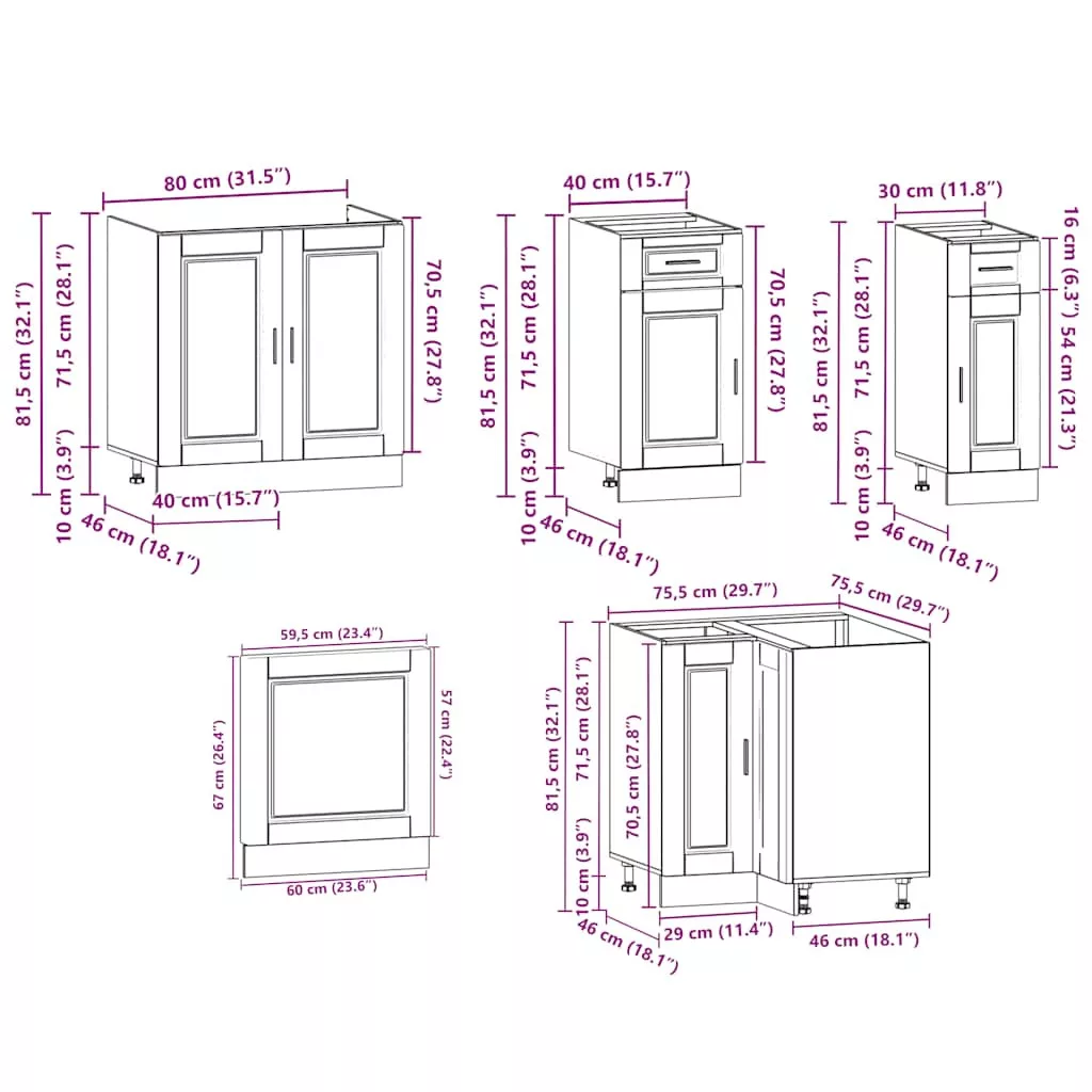 Ez az elegáns kialakítású, tizenegy részes konyhai szekrénygarnitúra optimalizálja konyhája terét, és bőséges tárolóhelyet biztosít személyes tárgyainak! Stabil és tartós anyag: A szerelt fa tartós és stabil anyag sima felülettel, amely ellenáll a nedvességnek, a vetemedésnek és a hasadásnak, így megbízható választás különféle célokhoz.Bőséges tárolóhely: A konyhaszekrénykészlet számos rekesszel rendelkezik, és elegendő helyet kínál tálak, tányérok, edények és egyéb konyhai eszközök tárolására.Állítható lábak: Az alsó szekrények állítható lábakkal rendelkeznek, amelyek magassága a konyha elrendezésének megfelelően állítható.Könnyen karbantartható: A sima felületnek köszönhetően ezek a konyhaszekrények könnyen tisztíthatók nedves ruhával, és kevesebb karbantartást igényelnek. Figyelem:A felborulás elkerülése érdekében ezt a terméket a mellékelt fali rögzítőeszközzel kell használni. Jó tudni:A falon belüli csavar(ok) és dugó(k) nem alaptartozékok. Keressen és használjon a falának megfelelő csavar(oka)t és dugó(ka)t. Ha bizonytalan, kérje szakember tanácsát. Gondosan olvassa el és kövesse a használati utasítás minden lépését.A munkalap, a mosogató és a csaptelep nem tartozéka a szállításnak.