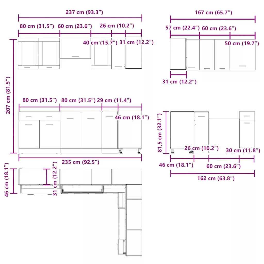 Ez az elegáns kialakítású, tizenegy részes konyhai szekrénygarnitúra optimalizálja konyhája terét, és bőséges tárolóhelyet biztosít személyes tárgyainak! Stabil és tartós anyag: A szerelt fa tartós és stabil anyag sima felülettel, amely ellenáll a nedvességnek, a vetemedésnek és a hasadásnak, így megbízható választás különféle célokhoz.Bőséges tárolóhely: A konyhaszekrénykészlet számos rekesszel rendelkezik, és elegendő helyet kínál tálak, tányérok, edények és egyéb konyhai eszközök tárolására.Állítható lábak: Az alsó szekrények állítható lábakkal rendelkeznek, amelyek magassága a konyha elrendezésének megfelelően állítható.Könnyen karbantartható: A sima felületnek köszönhetően ezek a konyhaszekrények könnyen tisztíthatók nedves ruhával, és kevesebb karbantartást igényelnek. Figyelem:A felborulás elkerülése érdekében ezt a terméket a mellékelt fali rögzítőeszközzel kell használni. Jó tudni:A falon belüli csavar(ok) és dugó(k) nem alaptartozékok. Keressen és használjon a falának megfelelő csavar(oka)t és dugó(ka)t. Ha bizonytalan, kérje szakember tanácsát. Gondosan olvassa el és kövesse a használati utasítás minden lépését.A munkalap, a mosogató és a csaptelep nem tartozéka a szállításnak.
