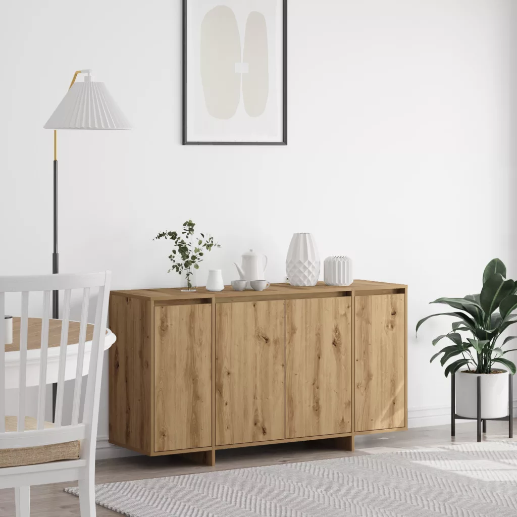 Ez a Művészi tölgy oldalszekrény egy jól megtervezett tárolási megoldás az étkezőkhöz. A természetes tölgy felülete és modern dizájn nemcsak jól néz ki, de segít a dolgokat is rendben tartani. Tökéletes választás azoknak, akik értékelik a stílust és a praktikusságot. Bőséges tárolóhely: Három ajtó és beépített polcok rendben tartják az étkeződet, tárolva mindent az edényektől a szalvétákig. Stílusos dizájn: A texturált művészi tölgy felület szuperül passzol a különböző belső stílusokhoz, és modern hangulata barátságosabbá teszi az étkezőt. Egyszerű karbantartás: Masszív mérnöki fából készült, csak egy gyors törlés szükséges, hogy megőrizze éles megjelenését, anélkül, hogy bonyodalmak lennének. Durable Material: Magas minőségű fa kompozitból készült, ez az oldalszekrény nemcsak jól néz ki, de elég tartós a mindennapi használatra, tökéletes családi összejövetelekhez. Sokoldalú funkcionalitás: Ideális étkezések és italok felszolgálására bulik során, ez az oldalszekrény duplán használható stílusos tárolóegységként otthonod bármely részén.
