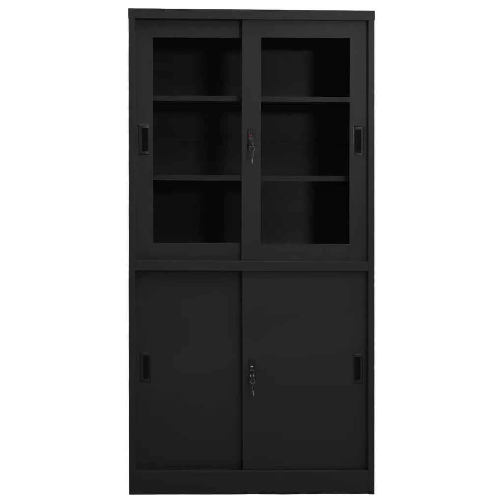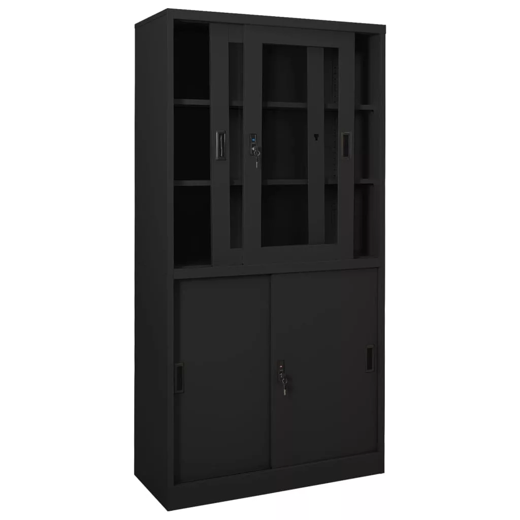 Szüntessen meg minden rendetlenséget az irodában ezzel a szekrénnyel! A tárolószekrény acélból és edzett üvegből készült, így rendkívül erős és tartós. A tolóajtó zökkenőmentes nyitást és zárást biztosít. A 3 állítható polccal rendelkező irattartó szekrény lehetővé teszi, hogy az iratokat rendezetten, különböző kategóriákba sorolja. Az irattartó szekrény zárakkal is rendelkezik, hogy megvédje személyes iratait a nem kívánt vendégektől.