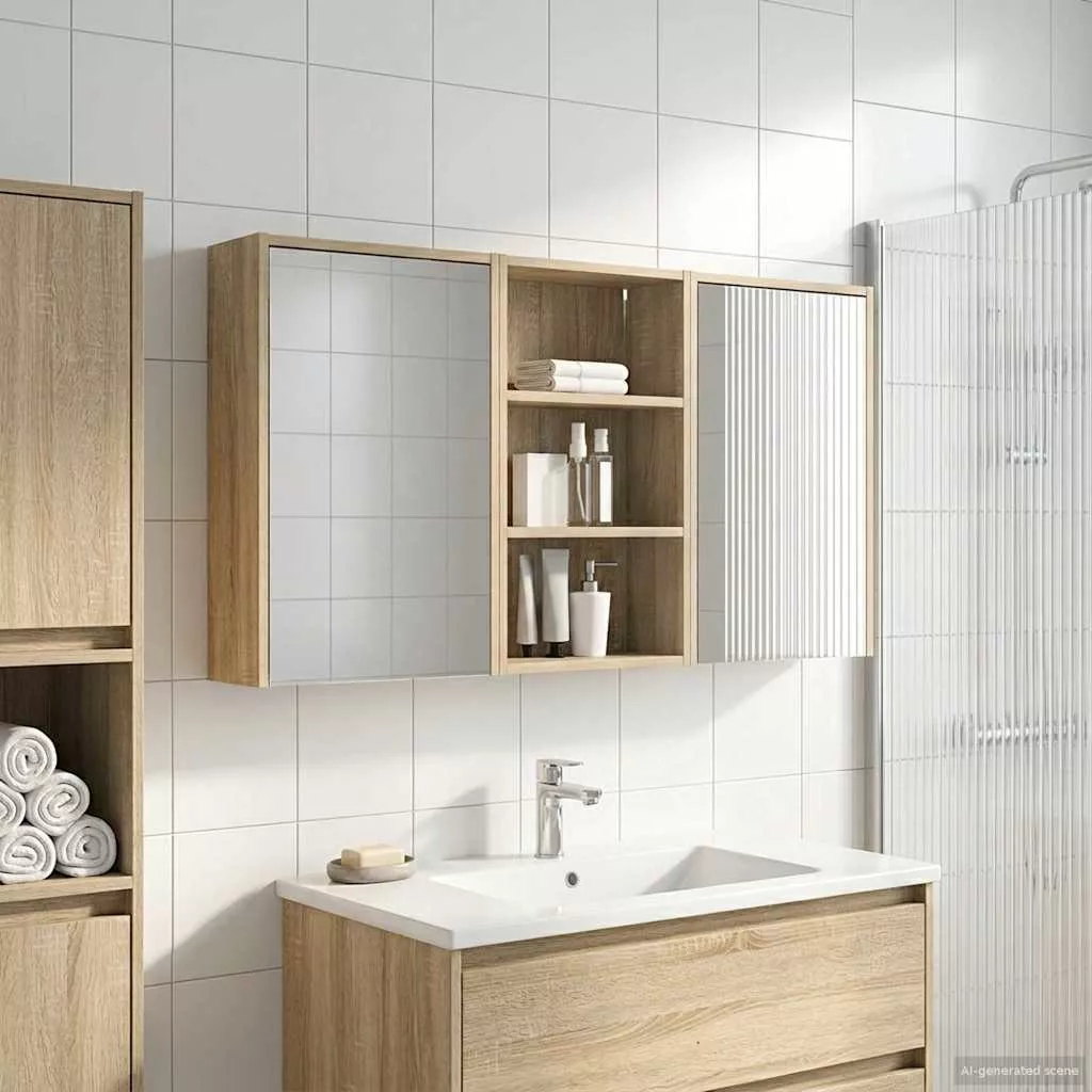 Ez a Fürdőszoba Szekrény Szett a modern fürdőszobák stílusos és praktikus megoldása. Az összeszerelt fa és a letisztult vonalak kombinációja egy különleges kétirányú tükröt rejteget, ami nemcsak optikailag növeli a teret, hanem izgalmat is csempész a fürdőszobába. Ez a szett tökéletes választás otthoni tulajdonosoknak és profi dizájnereknek egyaránt, hiszen nemcsak praktikus tárolást biztosít, de a minimalista dizájnnal és erős LED világítással feldobja a fürdőszoba hangulatát. A forma és funkció tökéletes párosítása! Összeszerelt fa felépítés: Ez a fürdőszoba szekrény szuper tartós és évekig bírja, ráadásul könnyen tisztítható, ami jól jön a nedves környezetben is. Kétfunkciós ajtók: A zsanéros üvegből készült ajtók simán működnek és elegáns átlátszóságot biztosítanak. Ezen belül rengeteg hely van a piperecikkeknek, így rendben tarthatod a fürdőszobádat. Innovatív világítás: Az állítható LED világítás gondoskodik róla, hogy mindig a legjobban láss, amikor a szépségápolásra kerül a sor, és emellett feldobja a fürdőszoba hangulatát is. USB-n keresztül működik, a lámpák nemcsak tárolásra jók, de jól is néznek ki. Kétirányú tükör: A különleges kétirányú tükör mélységet és eleganciát ad a szekrénynek. Perfect a privát fürdőszobákhoz, de ugyanolyan jól használható a sminkelés vagy borotválkozás során. Egyszerű falra szerelés: A modern lakásokhoz tervezve, a szekrény falra szerelhető, így helyet spórol és elegáns megjelenést ad. Ez a telepítési módszer bármilyen méretű fürdőszobába beleillik.