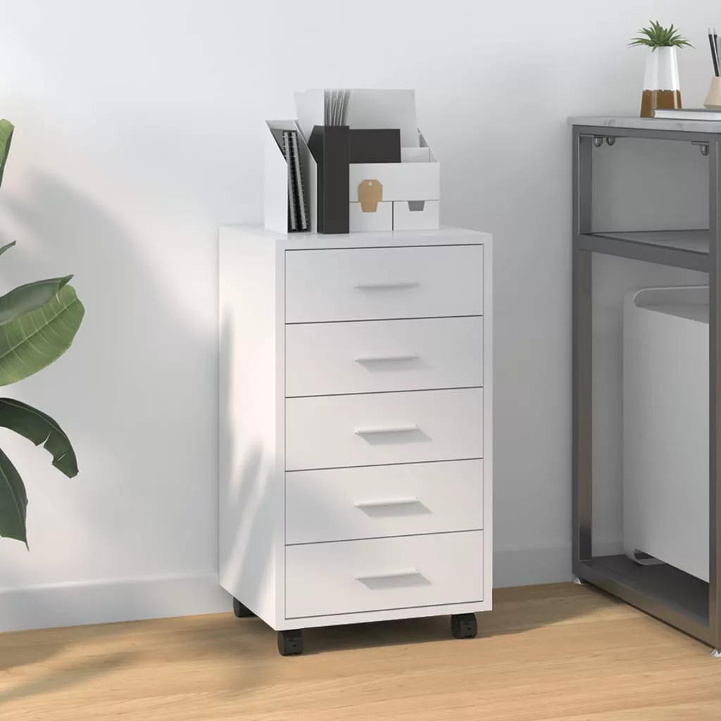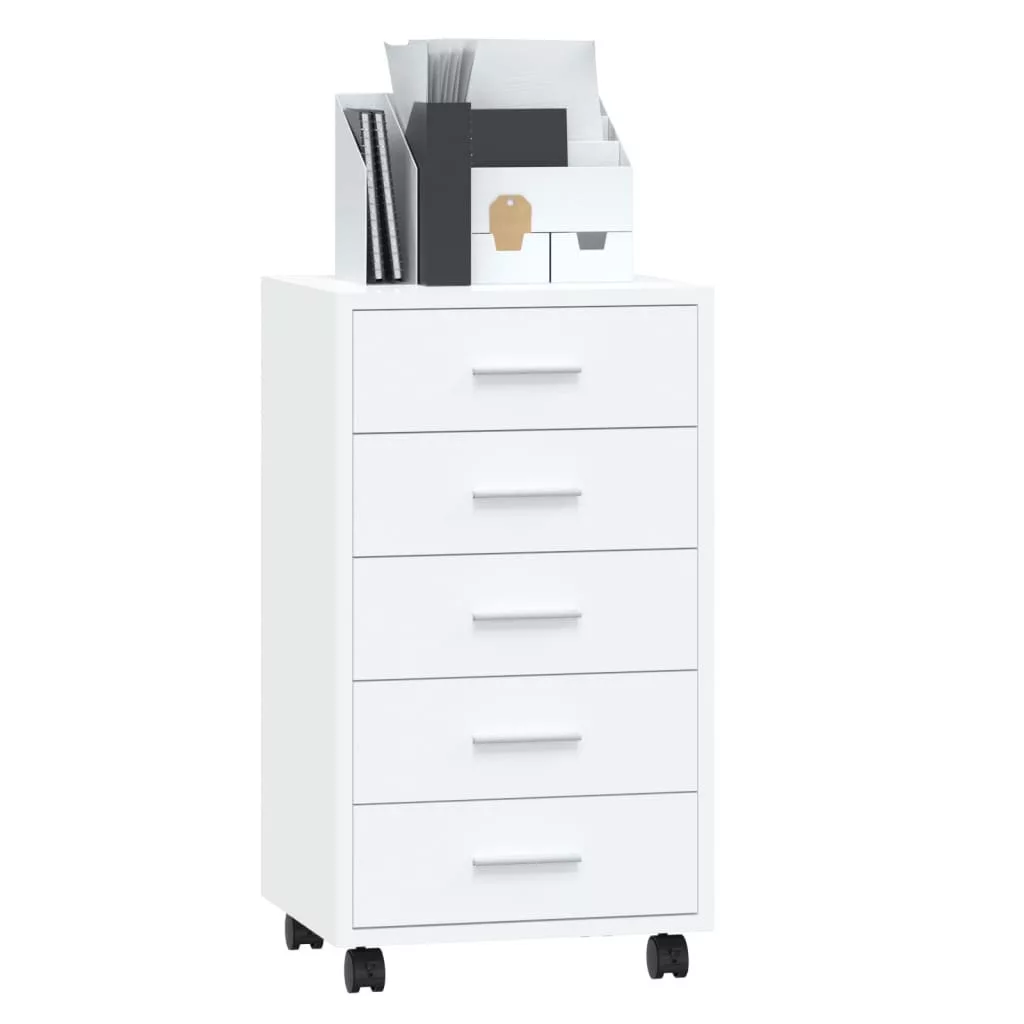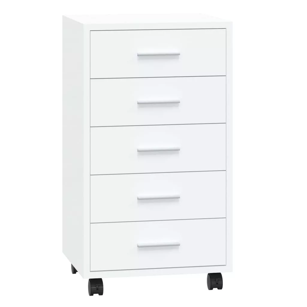 Ez a modern, elegáns, görgőkkel ellátott fiókos szekrény tökéletes és praktikus tárolóhely lesz bármilyen irodában vagy dolgozószobában. Tartós anyag: A szerelt fa kivételes minőségű, sima felületű, szilárd, stabil, és ellenáll a nedvességnek.Bőséges tárolóhely: A szekrény 5 fiókkal rendelkezik, amelyek bőséges tárhelyet biztosítanak dokumentumok, jegyzetfüzetek, tollak, papírtartó kapcsok, kulcsok és egyéb irodai kellékek számára.Rugalmas kialakítás: a 4 görgőnek köszönhetően a fiókos szekrény bárhova elhelyezhető és könnyen mozgatható. Ez a tárolószekrény tökéletesen passzol egy számítógépasztalhoz, valamint kiváló bútordarab a gyerekszobába. Megjegyzés: Az egyszerű összeszerelés érdekében minden termékhez mellékelünk összeszerelési útmutatót.