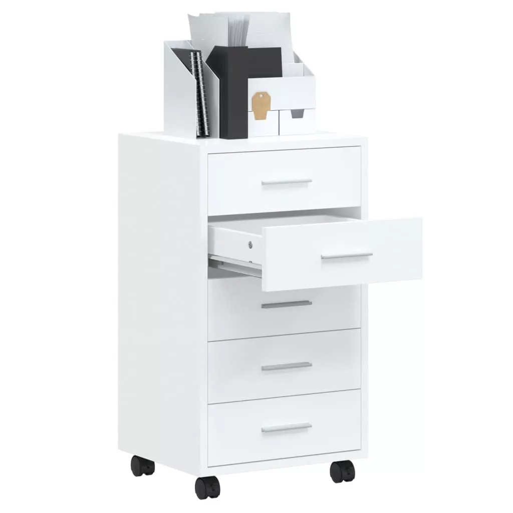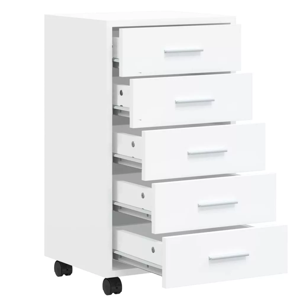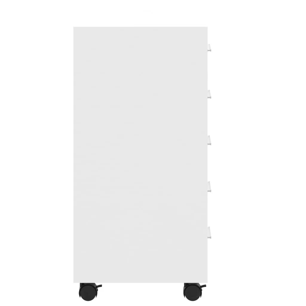 Ez a modern, elegáns, görgőkkel ellátott fiókos szekrény tökéletes és praktikus tárolóhely lesz bármilyen irodában vagy dolgozószobában. Tartós anyag: A szerelt fa kivételes minőségű, sima felületű, szilárd, stabil, és ellenáll a nedvességnek.Bőséges tárolóhely: A szekrény 5 fiókkal rendelkezik, amelyek bőséges tárhelyet biztosítanak dokumentumok, jegyzetfüzetek, tollak, papírtartó kapcsok, kulcsok és egyéb irodai kellékek számára.Rugalmas kialakítás: a 4 görgőnek köszönhetően a fiókos szekrény bárhova elhelyezhető és könnyen mozgatható. Ez a tárolószekrény tökéletesen passzol egy számítógépasztalhoz, valamint kiváló bútordarab a gyerekszobába. Megjegyzés: Az egyszerű összeszerelés érdekében minden termékhez mellékelünk összeszerelési útmutatót.