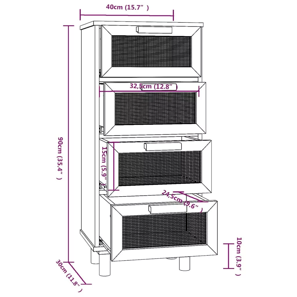 Ez a praktikus tálalószekrény számos igényét kielégíti, és a helyiség ideális kiegészítője lesz. Tartós anyag: A szerelt fa kivételes minőségű, sima felületű, szilárd, stabil, és ellenáll a nedvességnek.Bőséges tárolóhely: A 4 fiókkal felszerelt szekrény bőséges tárolóhelyet kínál alapvető holmijai kézközelben történő rendezett tárolásához. Ezenkívül a fiókban található természetes rattan szövésű dizájn extra szépséggel ruházza fel.Tömör fenyőfa lábak: A falábak természetes és kellemes megjelenést kölcsönöznek a tálalószekrénynek, és a stabilitást is biztosítják. Bármilyen környezetbe illeni fog.Masszív felső lap: A szekrény felső lapján elhelyezheti kedvenc fényképeit, dísztárgyait vagy virágokat a szoba dekorációjának gazdagítása érdekében. Megjegyzés:Az egyszerű összeszerelés érdekében minden termékhez mellékelünk összeszerelési útmutatót. Figyelem:A dőlés megakadályozása érdekében a terméket a mellékelt tartóelem segítségével rögzíteni kell a falhoz.