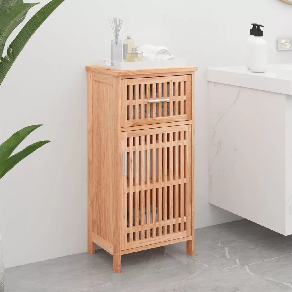 Ez a tágas tárolórésszel rendelkező fürdőszobaszekrény fürdőszobája nagyszerű kiegészítője lesz, rendezetté és lenyűgözővé alakítva azt! Tömör diófa: A tömör diófa sűrű és robusztus fa, mely rendkívül ellenálló a kopással szemben, valamint jellegzetes színéről és vonzó erezetmintájáról híres.Bőséges tárolóhely: A fürdőszobabútor 2 rekesszel és egy fiókkal rendelkezik, így bőséges helyet biztosít alapvető holmijai kézközelben történő rendezett tárolásához.Praktikus ajtó: Tartsa rendben környezetét azzal, hogy a kisebb tárgyakat a fürdőszobai tárolószekrény ajtaja mögé rejti.Kiváló szellőzés: A mosdószekrény ajtaja és fiókja rácsos kialakítású, így optimális szellőzést garantál. Figyelem:A dőlés megakadályozása érdekében a terméket a mellékelt tartóelem segítségével rögzíteni kell a falhoz. Megjegyzés:Az egyszerű összeszerelés érdekében minden termékhez mellékelünk összeszerelési útmutatót.
