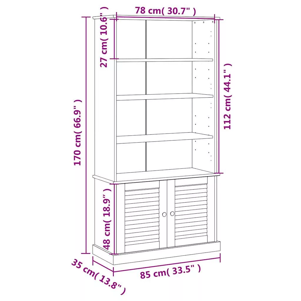 Ez a könyvespolc ideális megoldást kínál könyvei rendezett tárolásához, miközben rusztikus bájt varázsol enteriőrjébe. Tömör fenyőfa: A tömör fenyőfa egy gyönyörű természetes anyag. A fenyőfa egyenes erezetű, a csomók pedig jellegzetes, rusztikus megjelenést biztosítanak az anyagnak. Ez a tömör fenyőfából készült könyvespolc strapabíró és masszív.Bőséges tárolóhely: Ez a praktikus tárolószekrény polccal rendelkezik, amelyek bőséges helyet biztosítanak a könyvek, magazinok és dokumentumok rendezett tárolásához.Könnyen karbantartható: A könyvespolc könnyen tisztítható nedves ruhával, és kevesebb karbantartást igényel.Fémgombok: A tárolópolc fémgombokkal lett ellátva, amelyek megkönnyítik a kinyitását és zárását, miközben tovább növelik a szépségét. Figyelem:A felborulás elkerülése érdekében ezt a terméket a mellékelt fali rögzítőeszközzel kell használni.
