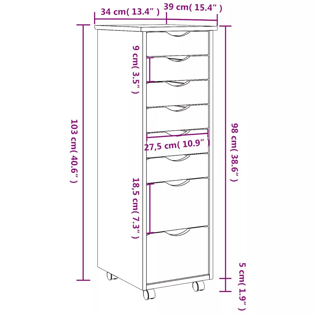 Ez a fiókos guruló szekrény segít a jobb munkavégzésben azáltal, hogy a dolgokat rendezetten és könnyen elérhető helyen tartja. Rugalmas kerekek: A kerekek révén a fiókos kocsi gyorsan és egyszerűen áthelyezhető bármilyen munkaterületre.Bőséges tárolóhely: Az iratszekrény bőséges tárhelyet biztosít a dokumentumok, könyvek vagy akták tárolására vagy osztályozására. A dolgozóterület alá helyezhető, hogy maximalizálja az alapterületet. A homorú fogantyú lehetővé teszi az egyes szintek kihúzását, hogy elérje, amire szüksége van.Tömör fenyőfa: A tömör fenyőfa egy gyönyörű természetes anyag. A fenyőfa erezete egyenes, a csomók pedig jellegzetes, rusztikus megjelenést kölcsönöznek az anyagnak.Széleskörű alkalmazás: Egyszerű kialakításának köszönhetően a fiókos szekrény minden helyiségbe jól illeszkedik. Praktikus tárolóként használható a nappaliban, hálószobában, konyhában, garázsban, irodában vagy kézműves helyiségben!Könnyen tisztítható: Az irodai szekrény sima felülettel rendelkezik, amely könnyen tisztítható nedves ruhával.