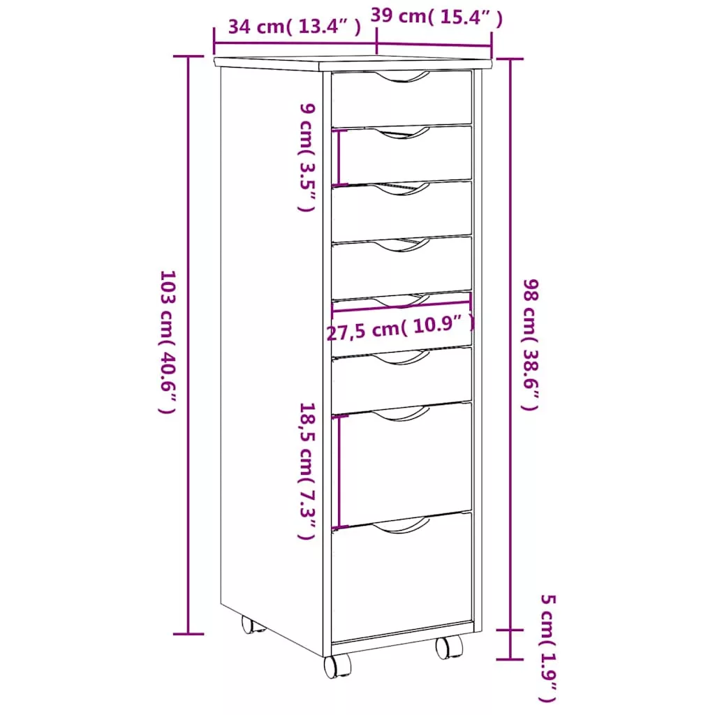 Ez a fiókos guruló szekrény segít a jobb munkavégzésben azáltal, hogy a dolgokat rendezetten és könnyen elérhető helyen tartja. Rugalmas kerekek: A kerekek révén a fiókos kocsi gyorsan és egyszerűen áthelyezhető bármilyen munkaterületre.Bőséges tárolóhely: Az iratszekrény bőséges tárhelyet biztosít a dokumentumok, könyvek vagy akták tárolására vagy osztályozására. A dolgozóterület alá helyezhető, hogy maximalizálja az alapterületet. A homorú fogantyú lehetővé teszi az egyes szintek kihúzását, hogy elérje, amire szüksége van.Tömör fenyőfa: A tömör fenyőfa egy gyönyörű természetes anyag. A fenyőfa erezete egyenes, a csomók pedig jellegzetes, rusztikus megjelenést kölcsönöznek az anyagnak.Széleskörű alkalmazás: Egyszerű kialakításának köszönhetően a fiókos szekrény minden helyiségbe jól illeszkedik. Praktikus tárolóként használható a nappaliban, hálószobában, konyhában, garázsban, irodában vagy kézműves helyiségben!Könnyen tisztítható: Az irodai szekrény sima felülettel rendelkezik, amely könnyen tisztítható nedves ruhával.