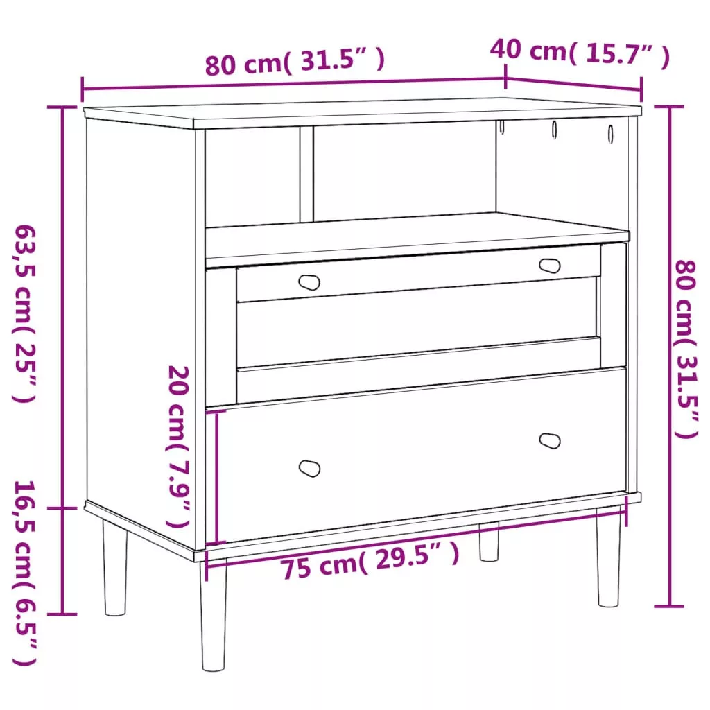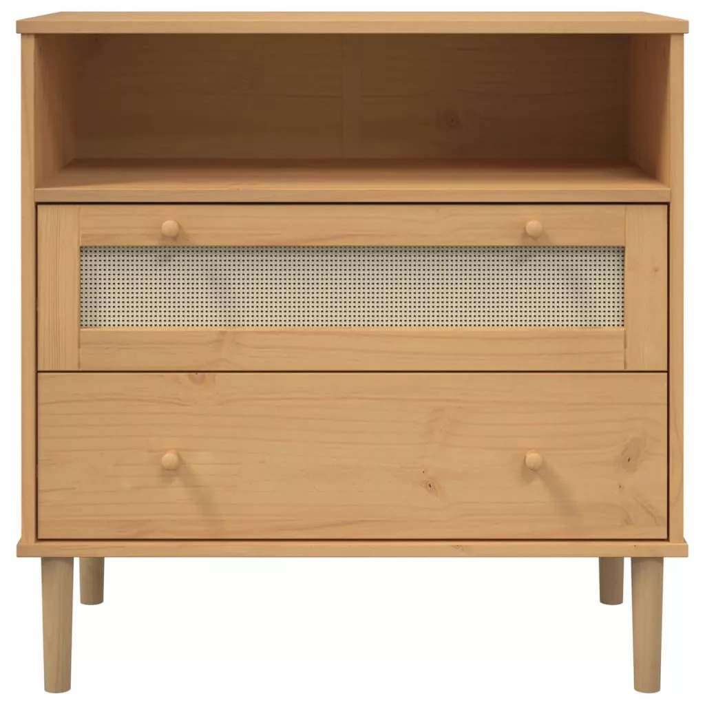 Ez a minimalista bájjal rendelkező fa tálalószekrény megfelel tárolási igényeinek, és egyedi megjelenést visz a helyiségbe. Tömör fenyőfa: A tömör fenyőfa egy gyönyörű természetes anyag. A fenyőfa erezete egyenes, a csomók pedig jellegzetes, rusztikus megjelenést kölcsönöznek az anyagnak.UV-lakk: Az UV-lakk egy speciális lakktípus, amely ultraibolya-szárítógéppel készül. Élénkebb, fényűzőbb és tapinthatóbb felületet hoz létre a nem UV-lakkokhoz képest.Bőséges tárolóhely: Ez a kisszekrény két fiókkal és egy rekesszel rendelkezik, így bőséges helyet biztosít folyóiratai, könyvei, DVD-i, multimédiás eszközei és egyéb alapvető holmijai kézközelben történő rendezett tárolásához.Rattanhatású felület: A tárolószekrény fiókjának elülső felülete kézzel készült polirattanból, amely a századközép modern és bohém stílusainak kéttónusú keveréke, amely hangulatos, mégis elegáns megjelenést visz otthonába.Stabil lap: A masszív lap tökéletes helyet nyújt cserepes növények, képkeretek és egyéb dísztárgyak elhelyezésére. Figyelem:A felborulás elkerülése érdekében ezt a terméket a mellékelt fali rögzítőeszközzel kell használni.