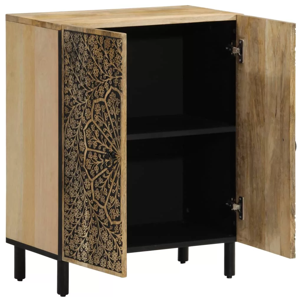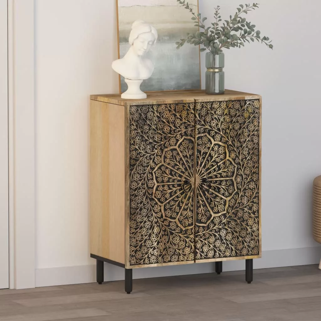 Ez az időtlen megjelenésű szekrény otthona kiváló kiegészítője lehet. Tömör mangófa: A tömör mangófa egy erős, trópusi keményfa, melyből strapabíró bútorok készíthetőek. A fa gyönyörű erezetének köszönhetően minden darab kissé különbözik a többitől. A tömör mangófából készült szekrény rendkívül tartós és stabil.Bőséges tárolóhely: A kisszekrény bőséges helyet biztosít alapvető holmijai kézközelben történő rendezett tárolásához.Bemutató funkció: A tárolószekrény teteje tökéletes dísztárgyak, fotóalbumok vagy kis növények elhelyezésére.Masszív lábak: A vaslábak szilárdságot és stabilitást biztosítanak a tálalószekrénynek.Retro stílus: Ez a kézzel faragott virágmintákkal díszített otthoni rendszerező a retro stílus luxusát viszi otthonába, így garantáltan a szoba központi eleme lesz. Jó tudni:Minden termék egyedi, a szín és az erezet változik. A kiszállítás véletlenszerűen történik, biztosítva terméke exkluzivitását és egyediségét. Figyelem:A felborulás elkerülése érdekében ezt a terméket a mellékelt fali rögzítőeszközzel kell használni.