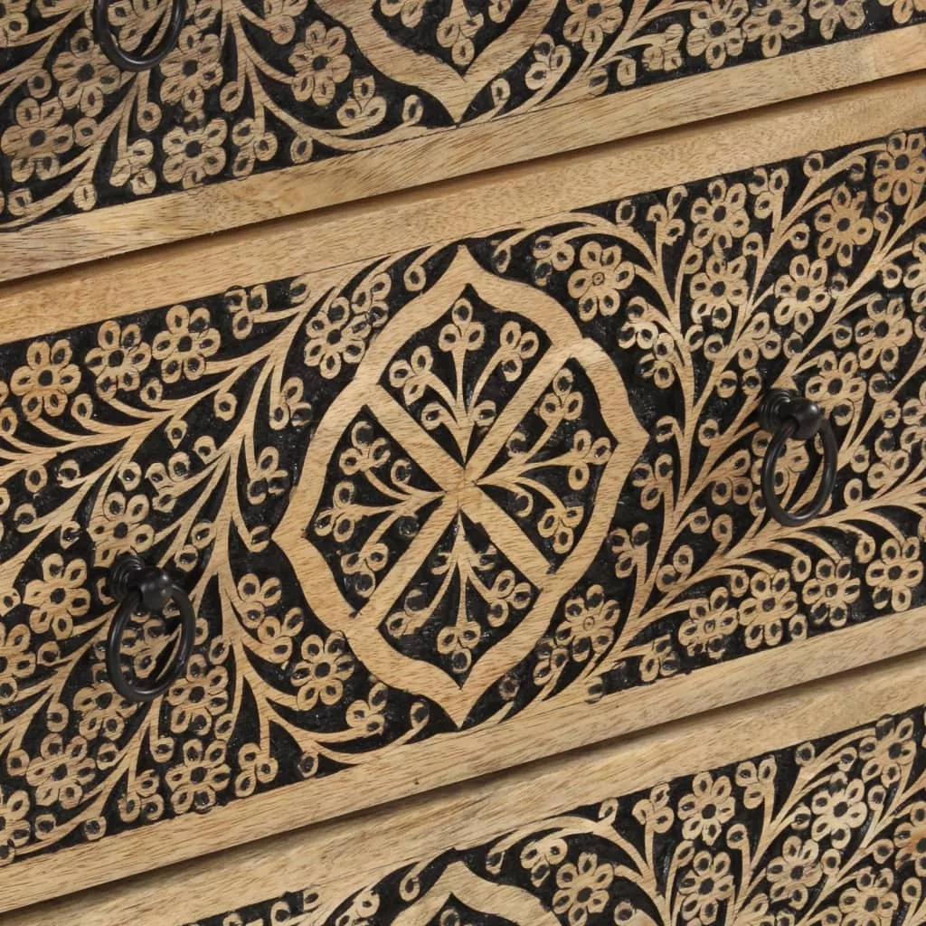 Ez az időtlen megjelenésű szekrény otthona kiváló kiegészítője lehet. Tömör mangófa: A tömör mangófa egy erős, trópusi keményfa, melyből strapabíró bútorok készíthetőek. A fa gyönyörű erezetének köszönhetően minden darab kissé különbözik a többitől. A tömör mangófából készült szekrény rendkívül tartós és stabil.Bőséges tárolóhely: A kisszekrény bőséges helyet biztosít alapvető holmijai kézközelben történő rendezett tárolásához.Bemutató funkció: A tárolószekrény teteje tökéletes dísztárgyak, fotóalbumok vagy kis növények elhelyezésére.Masszív lábak: A vaslábak szilárdságot és stabilitást biztosítanak a tálalószekrénynek.Retro stílus: Ez a kézzel faragott virágmintákkal díszített otthoni rendszerező a retro stílus luxusát viszi otthonába, így garantáltan a szoba központi eleme lesz. Jó tudni:Minden termék egyedi, a szín és az erezet változik. A kiszállítás véletlenszerűen történik, biztosítva terméke exkluzivitását és egyediségét. Figyelem:A felborulás elkerülése érdekében ezt a terméket a mellékelt fali rögzítőeszközzel kell használni.