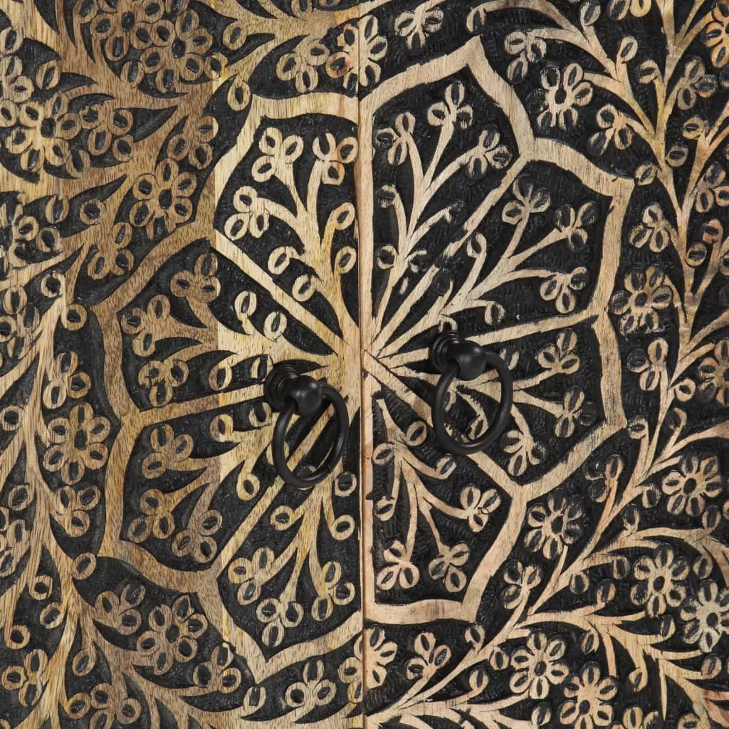 Ez az időtlen megjelenésű szekrény otthona kiváló kiegészítője lehet. Tömör mangófa: A tömör mangófa egy erős, trópusi keményfa, melyből strapabíró bútorok készíthetőek. A fa gyönyörű erezetének köszönhetően minden darab kissé különbözik a többitől. A tömör mangófából készült szekrény rendkívül tartós és stabil.Bőséges tárolóhely: A kisszekrény bőséges helyet biztosít alapvető holmijai kézközelben történő rendezett tárolásához.Bemutató funkció: A tárolószekrény teteje tökéletes dísztárgyak, fotóalbumok vagy kis növények elhelyezésére.Masszív lábak: A vaslábak szilárdságot és stabilitást biztosítanak a tálalószekrénynek.Retro stílus: Ez a kézzel faragott virágmintákkal díszített otthoni rendszerező a retro stílus luxusát viszi otthonába, így garantáltan a szoba központi eleme lesz. Jó tudni:Minden termék egyedi, a szín és az erezet változik. A kiszállítás véletlenszerűen történik, biztosítva terméke exkluzivitását és egyediségét. Figyelem:A felborulás elkerülése érdekében ezt a terméket a mellékelt fali rögzítőeszközzel kell használni.