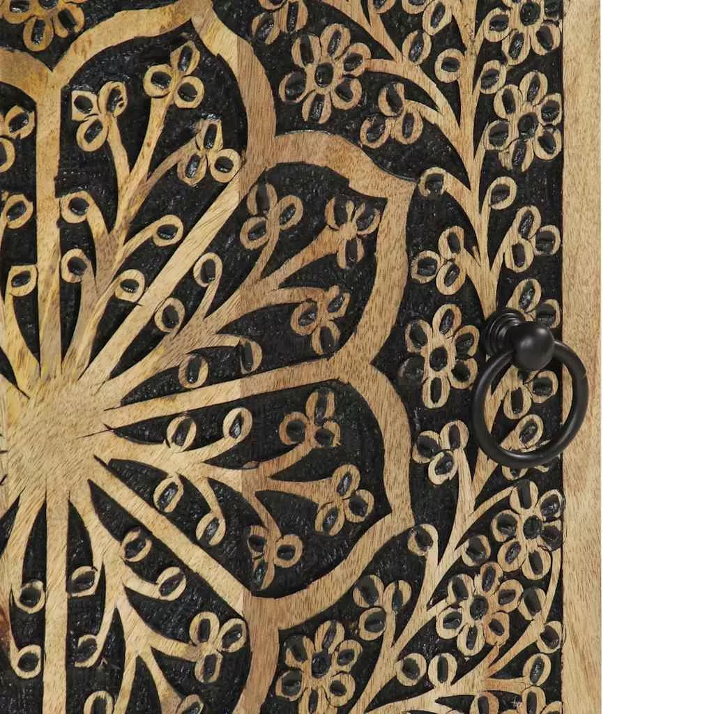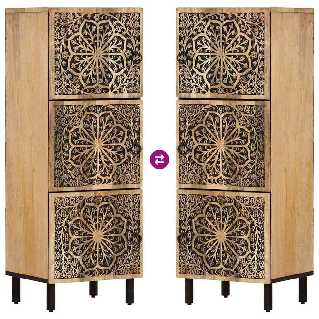 Ez a klasszikus stílusú magasszekrény otthona dekoratív és praktikus kiegészítője lesz. Tömör mangófa: A tömör mangófa egy erős, trópusi keményfa, melyből strapabíró bútorok készíthetőek. A fa gyönyörű erezetének köszönhetően minden darab kissé különbözik a többitől. A tömör mangófából készült szekrény rendkívül tartós és stabil.Bőséges tárolóhely: A tálalószekrény bőséges helyet biztosít alapvető holmijai kézközelben történő rendezett tárolásához.Praktikus ajtó: Tartsa rendben környezetét azzal, hogy a kisebb tárgyakat a kisszekrény ajtajai mögé rejti.Masszív lábak: A vaslábak szilárdságot és stabilitást biztosítanak a tálalószekrénynek.Retro stílus: Ez a kézzel faragott virágmintákkal díszített tárolószekrény a retro stílus luxusát viszi otthonába, így garantáltan a helyiség központi eleme lesz. Jó tudni:Minden termék egyedi, a szín és az erezet változik. A kiszállítás véletlenszerűen történik, biztosítva terméke exkluzivitását és egyediségét. Figyelem:A felborulás elkerülése érdekében ezt a terméket a mellékelt fali rögzítőeszközzel kell használni.