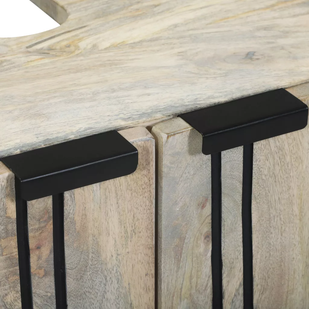 Ez a mosdószekrény a stílust és a praktikusságot kombinálja, így remek kiegészítője bármilyen fürdőszobának. Téglalap alakja perfekt a klasszikus és modern belső terekhez, azonnal feldobja a helységed megjelenését. Rengeteg tárolóhelyet biztosít, hogy a fürdőszobai cuccaidat rendben tartsd. Anyagok: Tömör mangófából, szerelt fából és vasból készült, így ez a szekrény tartós. Az anyagok keveréke erőt ad, és elegáns megjelenést biztosít a különböző belső stílusoknak. Beépített elemek: Számos polcot tartalmaz a jó tárolás és szervezés érdekében. Minden polc tökéletes a piperecikkek és törölközők tárolására, így rendben tartva a dolgokat. Jellemzők / Funkció / Dizájn: Texturált megjelenésével és masszív téglalap alakjával ez a szekrény sokoldalú dizájnnal rendelkezik, ami beltéri használatra ideális. Elrendezése segít optimumra hozni a teret, miközben jól néz ki. Ajánlott használat: Tökéletes fürdőszobákhoz, ez a szekrény segít rendet tartani a zsúfolt helyeken. Praktikus megoldás a tárolásra, gyors hozzáférést biztosít a napi dolgokhoz, miközben rendszerezett marad. Karban tartás: Ahhoz, hogy jól nézzen ki, csak egy száraz ruhával kell letörölnöd a port. Kerüld a durva vegyszereket, hogy a felületek jó állapotban maradjanak.