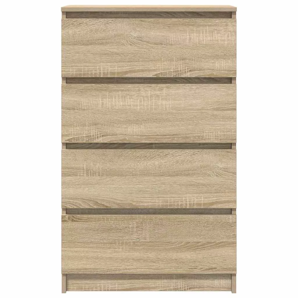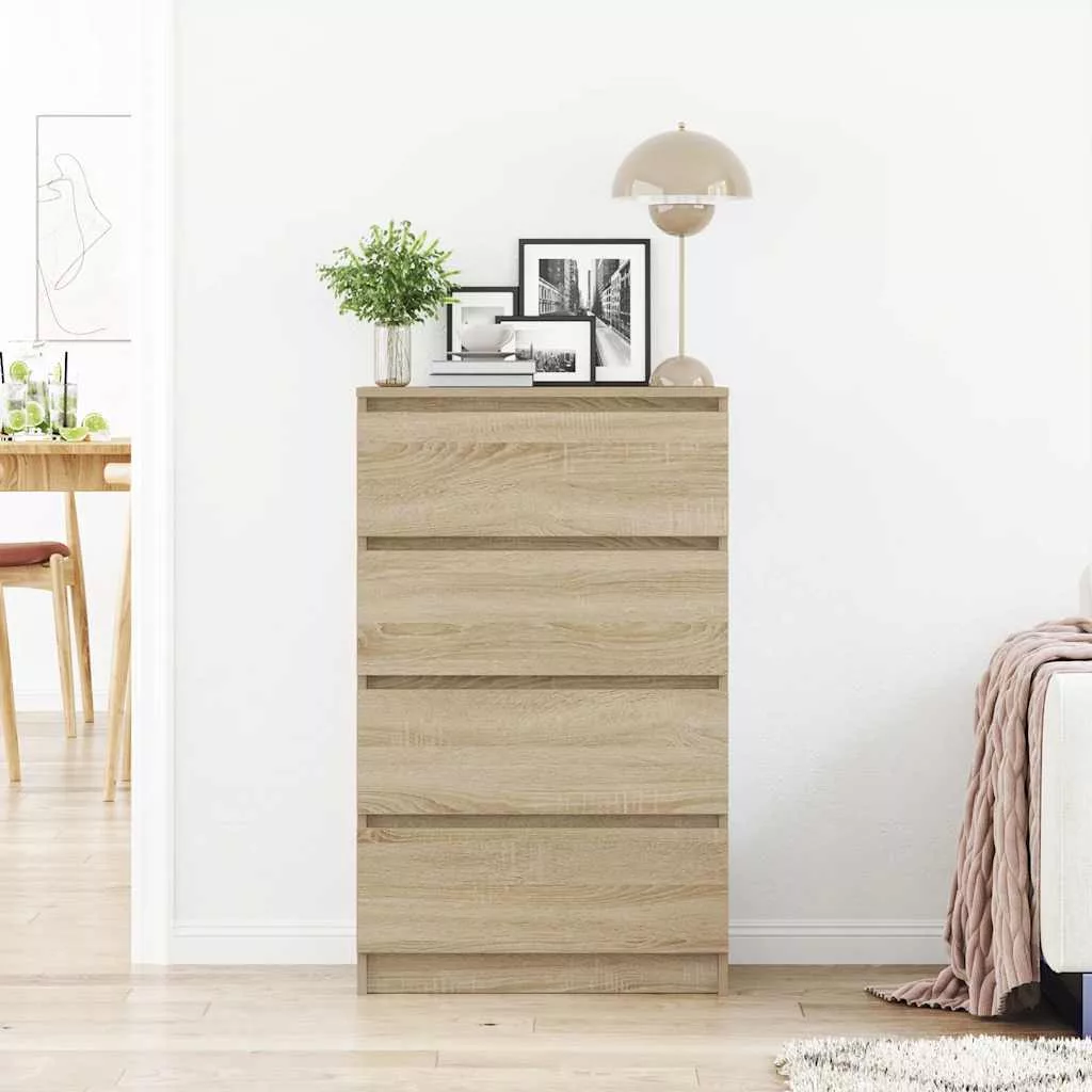 Ez a minimalista stílusú komód nemcsak praktikus, hanem igen dekoratív kiegészítője lesz otthonának A 4 fiókkal rendelkező tálalószekrény bőséges tárolóhelyet biztosít könyvek, multimédiás készülékek és egyéb tárgyak számára. Masszív teteje ideális dísztárgyak, képkeretek vagy cserepes növények megjelenítésére. Komódként, tálalóként stb. is használható. A minőségi szerelt fának köszönhetően igen tartós és strapabíró. A fiókos szekrény nedves ruhával könnyen tisztítható.