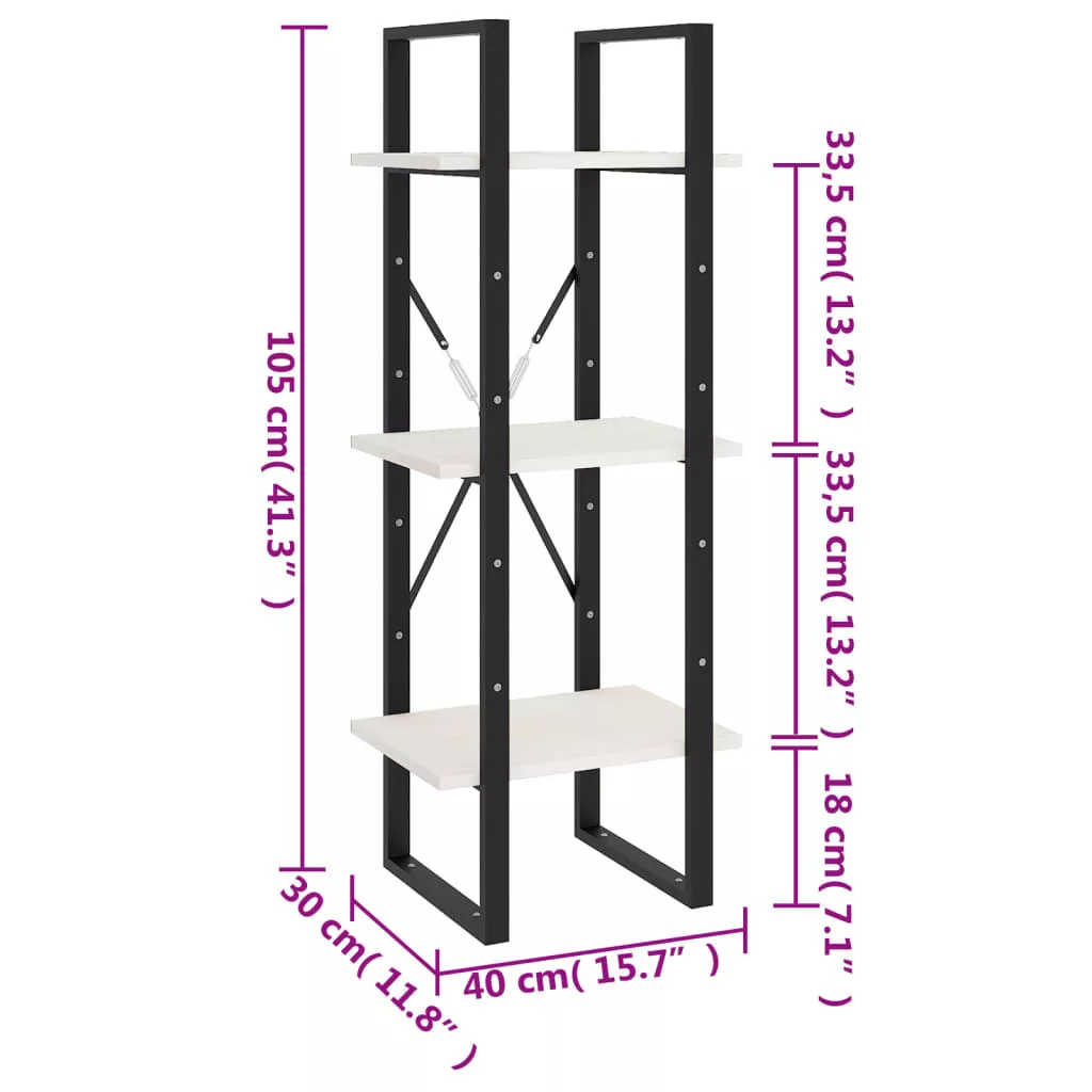 3-szintes fehér tömör fenyőfa könyvszekrény 40 x 30 x 105 cm