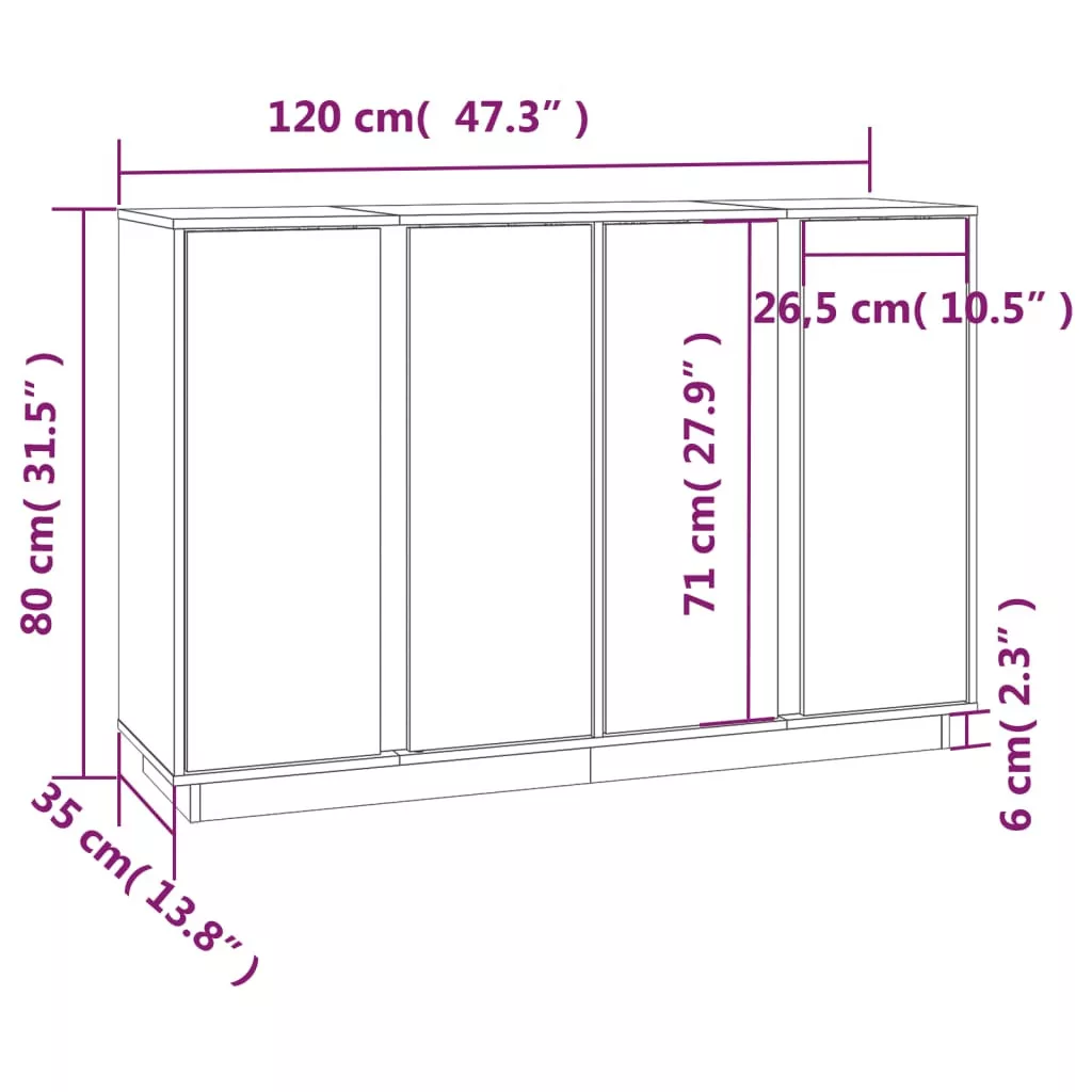 Ez a klasszikus, időtlen megjelenésű tálalószekrény otthona nagyszerű kiegészítője lesz. Tömör fenyőfa: A tömör fenyőfa egy gyönyörű természetes anyag. A fenyőfa erezete egyenes, a csomók pedig jellegzetes, rusztikus megjelenést kölcsönöznek az anyagnak.Bőséges tárolóhely: A szekrény bőséges helyet biztosít alapvető holmijai kézközelben történő rendezett tárolásához.Bemutatófunkció: A szekrény teteje tökéletes dísztárgyak, fotóalbumok vagy kis növények elhelyezésére. Megjegyzés:Az egyszerű összeszerelés érdekében minden termékhez mellékelünk összeszerelési útmutatót.Figyelem:A dőlés megakadályozása érdekében a terméket a mellékelt tartóelem segítségével rögzíteni kell a falhoz