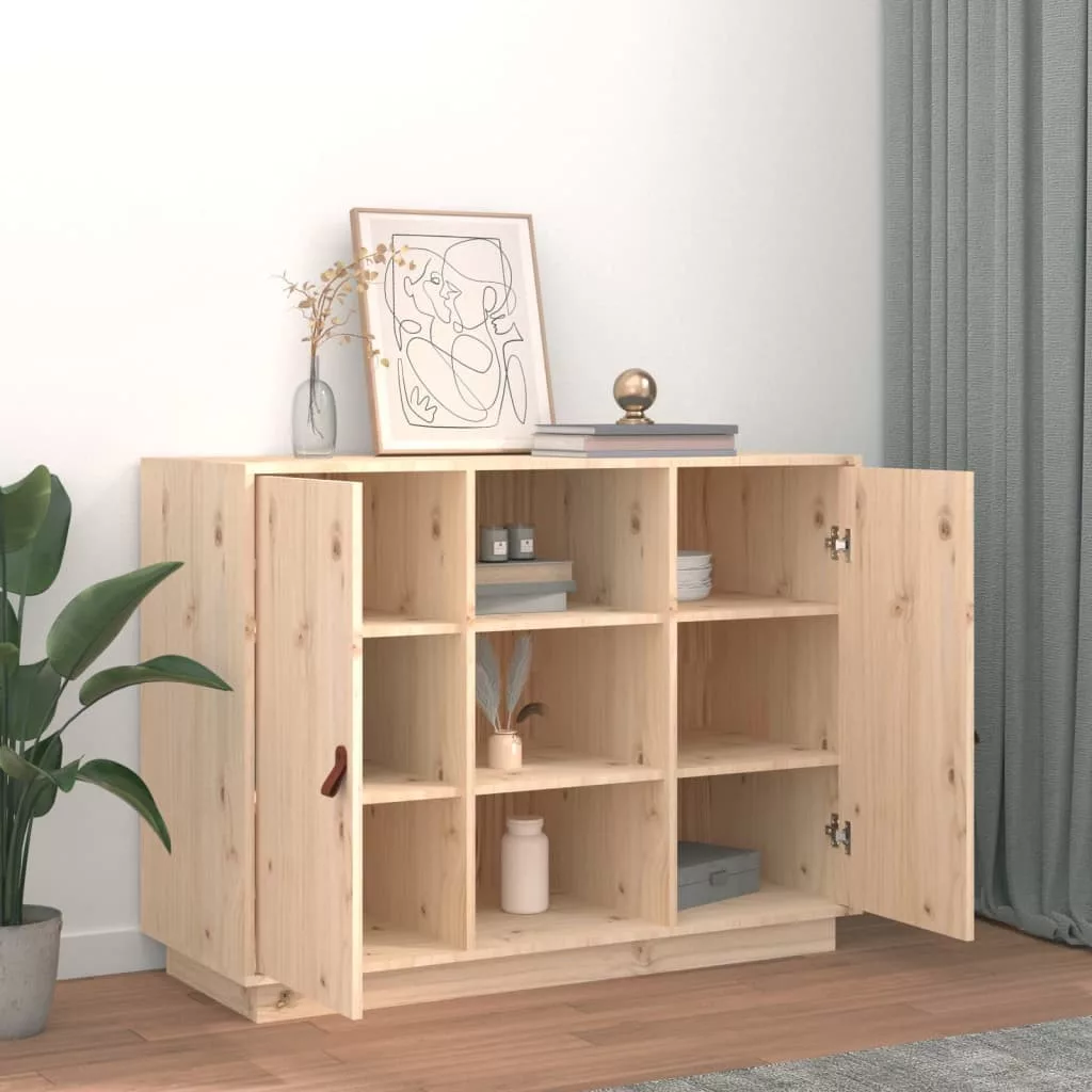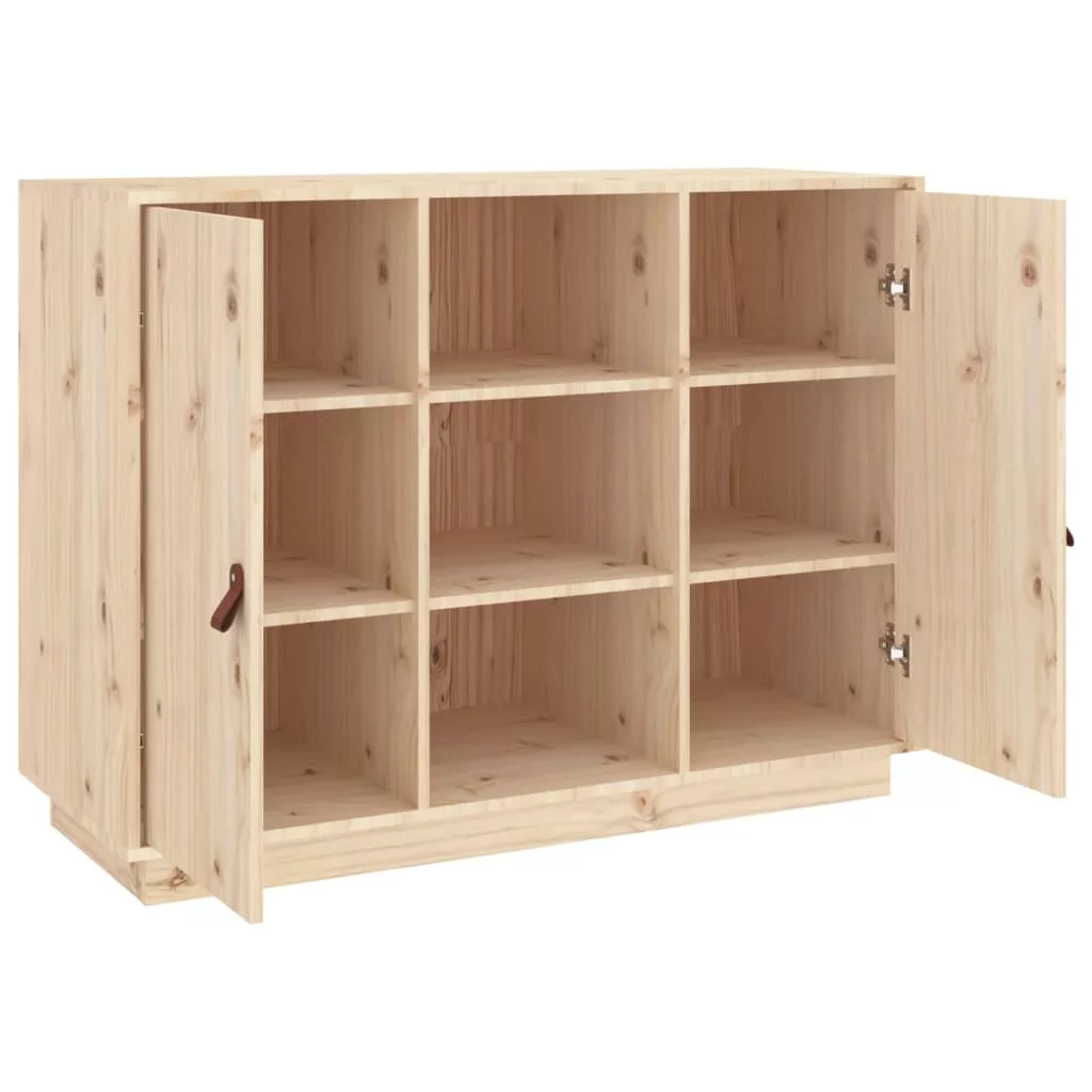 Ez a praktikus fa tálalószekrény számos igényét kielégíti, és a helyiség ideális kiegészítője lesz. Tömör fenyőfa: Ez a szekrény tömör fenyőfából készült. A tömör fenyőfa egy gyönyörű, természetes anyag. A fenyőfa egyenes erezetű, a csomók pedig jellegzetes, rusztikus megjelenést kölcsönöznek a bútornak.Elegendő tárhely: A rekeszekkel és ajtókkal felszerelt tálalószekrény bőséges helyet kínál az alapvető holmik kézközelben történő rendezett tárolásához.Masszív felső lap: A szekrény felső lapján elhelyezheti kedvenc fényképeit, dísztárgyait vagy virágokat a szoba dekorációjának gazdagítása érdekében.Praktikus kialakítás: Ez a tárolószekrény ajtókkal lett felszerelve, amely megvédi dolgait a portól és szennyeződésektől. Figyelem:A dőlés megakadályozása érdekében a terméket a mellékelt tartóelem segítségével rögzíteni kell a falhoz. Megjegyzés:Az egyszerű összeszerelés érdekében minden termékhez mellékelünk összeszerelési útmutatót.