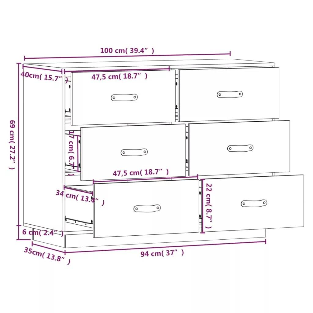 Ez a fa tálalószekrény számos igényét kielégíti, és a helyiség kiváló kiegészítője lesz. Tömör fenyőfa: A tömör fenyőfa egy gyönyörű természetes anyag. A fenyőfa erezete egyenes, a csomók pedig jellegzetes, rusztikus megjelenést kölcsönöznek az anyagnak.Stabil váz: A faváz erős szerkezetet és stabilitást biztosít.Bőséges tárolóhely: A tálalószekrény 6 fiókkal rendelkezik, így elegendő tárolóhelyet kínál holmijai rendezett és kézközelben történő tárolásához.Masszív asztallap: A kisasztal lapja tökéletes dísztárgyai, képkeretei és cserepes növényei elhelyezésére. Figyelem:A dőlés megakadályozása érdekében a terméket a mellékelt tartóelem segítségével rögzíteni kell a falhoz. Megjegyzés:Az egyszerű összeszerelés érdekében minden termékhez mellékelünk összeszerelési útmutatót.