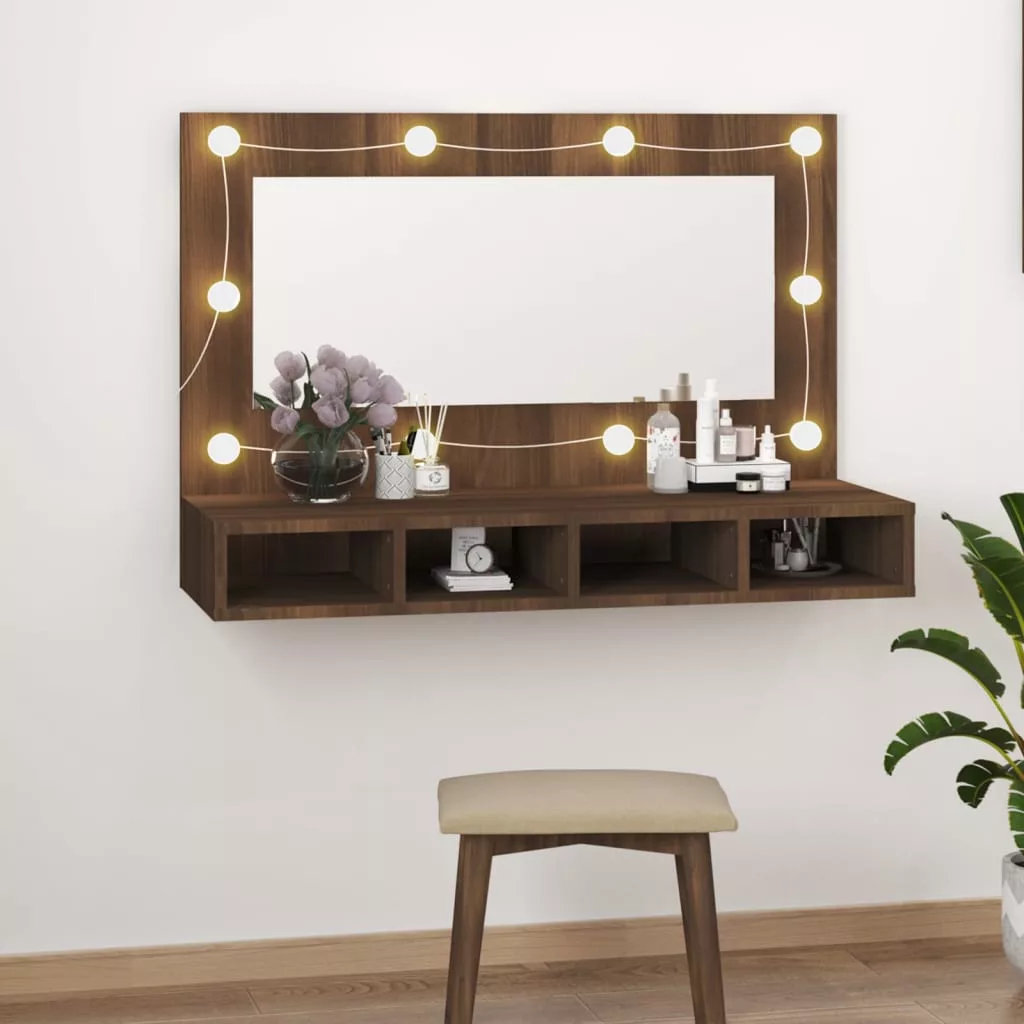 barna tölgy színű tükrös szekrény LED-ekkel 90 x 31,5 x 62 cm