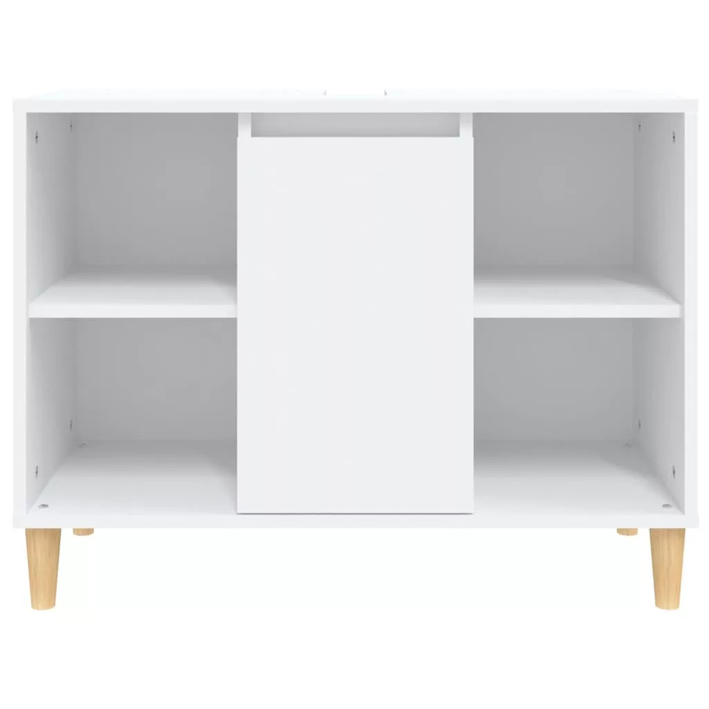 Ez a mosdószekrény fürdőszobája nagyszerű kiegészítője lesz, rendezett és lenyűgöző megjelenést kölcsönözve neki! Tartós anyag: A szerelt fa kivételes minőségű, sima felületű, szilárd, stabil, és ellenáll a nedvességnek.Bőséges tárolóhely: A fürdőszobai mosdószekrény 5 rekesszel és egy ajtóval rendelkezik, amelyek különféle tárolási lehetőségeket és extra helyet kínálnak a fürdőszobában lévő tárgyak tárolására. A fürdőszobaszekrény teteje ideális a mosdókagyló elhelyezésére.Falábak: A tömör eukaliptuszfa lábak természetes és kellemes megjelenést kölcsönöznek a mosdó alatti szekrénynek, és a stabilitást is biztosítják.Könnyen tisztítható felület: A fürdőszobabútor nedves ruhával könnyen tisztítható. Figyelem:A felborulás elkerülése érdekében ezt a terméket a mellékelt fali rögzítőeszközzel kell használni. Jó tudni:A szerelés megkönnyítése érdekében minden termék kézikönyvvel együtt kerül kiszállításra.A szállítás a mosdókagylót nem tartalmazza.