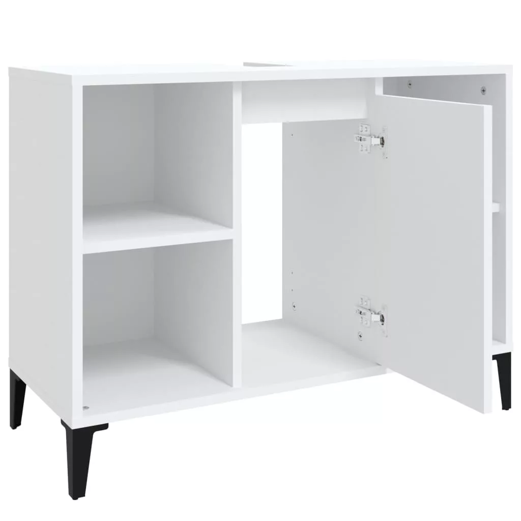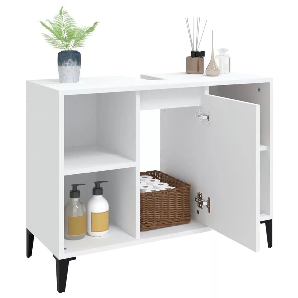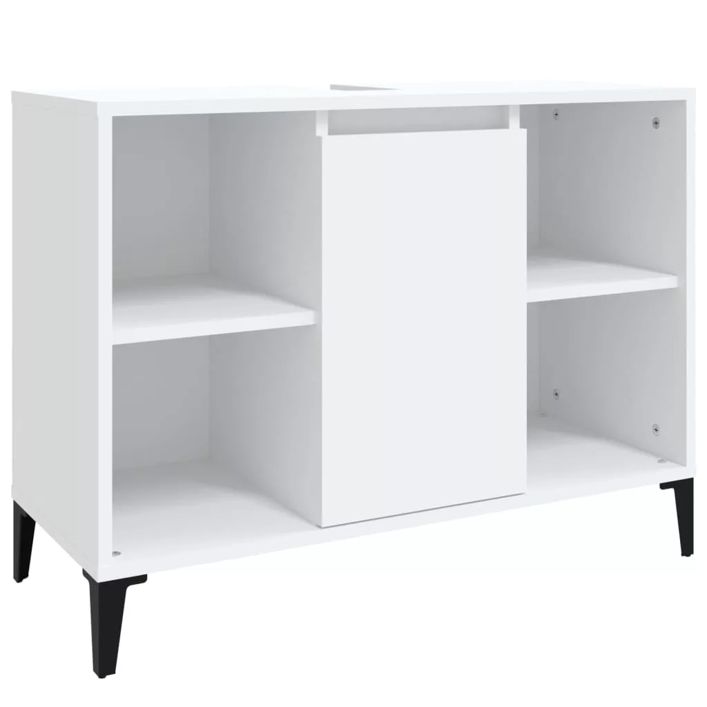 Ez a mosdószekrény fürdőszobája nagyszerű kiegészítője lesz, rendezett és lenyűgöző megjelenést kölcsönözve neki! Tartós anyag: A szerelt fa kivételes minőségű, sima felületű, szilárd, stabil, és ellenáll a nedvességnek.Bőséges tárolóhely: A fürdőszobai mosdószekrény 5 rekesszel és egy ajtóval rendelkezik, amelyek különféle tárolási lehetőségeket és extra helyet kínálnak a fürdőszobában lévő tárgyak tárolására. A fürdőszobaszekrény teteje ideális a mosdókagyló elhelyezésére.Fémlábak: A fémlábak modern és nyugodt stílust kölcsönöznek a belső térnek, miközben stabilitást biztosítanak.Könnyen tisztítható felület: A fürdőszobabútor nedves ruhával könnyen tisztítható. Figyelem:A felborulás elkerülése érdekében ezt a terméket a mellékelt fali rögzítőeszközzel kell használni. Jó tudni:A szerelés megkönnyítése érdekében minden termék kézikönyvvel együtt kerül kiszállításra.A szállítás a mosdókagylót nem tartalmazza.