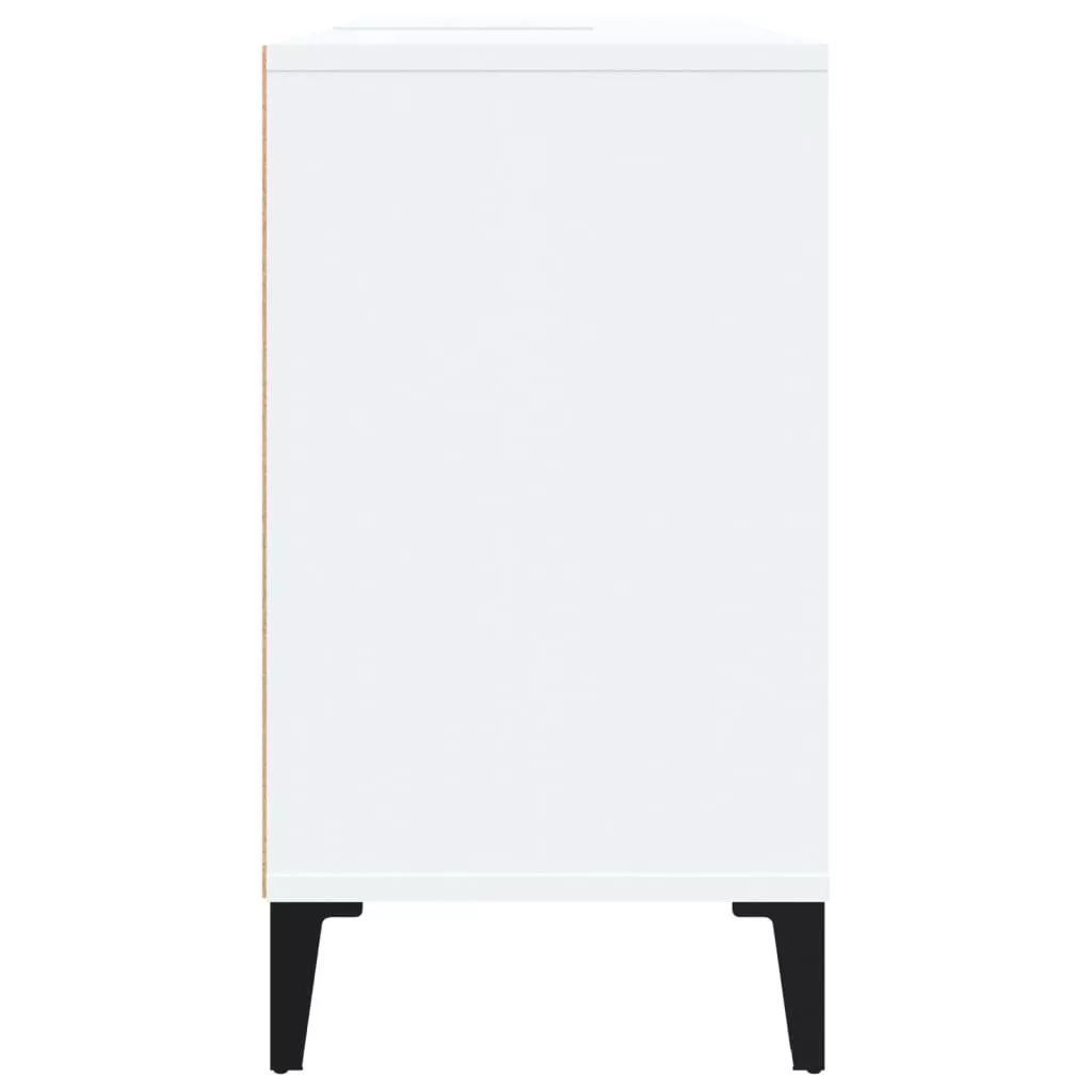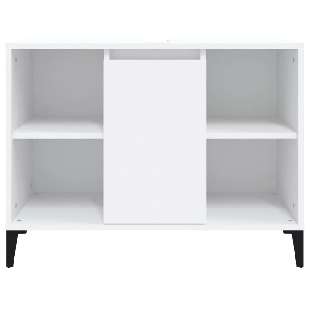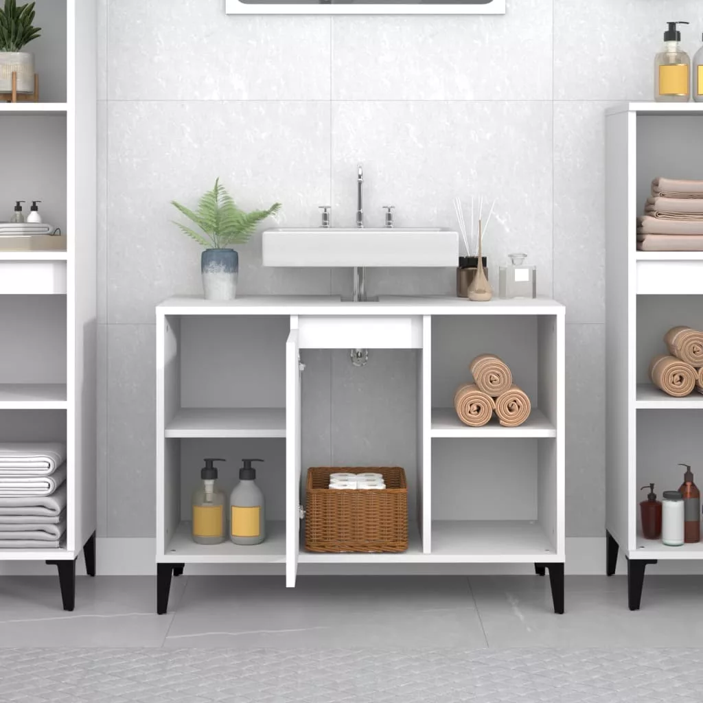 Ez a mosdószekrény fürdőszobája nagyszerű kiegészítője lesz, rendezett és lenyűgöző megjelenést kölcsönözve neki! Tartós anyag: A szerelt fa kivételes minőségű, sima felületű, szilárd, stabil, és ellenáll a nedvességnek.Bőséges tárolóhely: A fürdőszobai mosdószekrény 5 rekesszel és egy ajtóval rendelkezik, amelyek különféle tárolási lehetőségeket és extra helyet kínálnak a fürdőszobában lévő tárgyak tárolására. A fürdőszobaszekrény teteje ideális a mosdókagyló elhelyezésére.Fémlábak: A fémlábak modern és nyugodt stílust kölcsönöznek a belső térnek, miközben stabilitást biztosítanak.Könnyen tisztítható felület: A fürdőszobabútor nedves ruhával könnyen tisztítható. Figyelem:A felborulás elkerülése érdekében ezt a terméket a mellékelt fali rögzítőeszközzel kell használni. Jó tudni:A szerelés megkönnyítése érdekében minden termék kézikönyvvel együtt kerül kiszállításra.A szállítás a mosdókagylót nem tartalmazza.