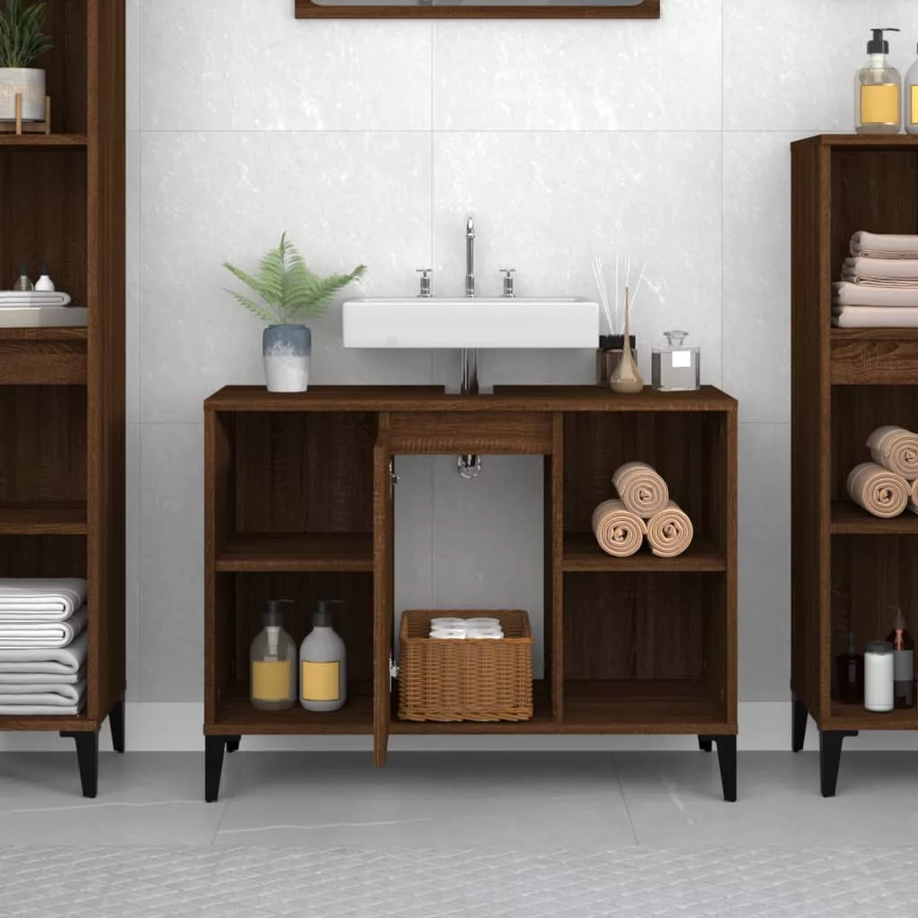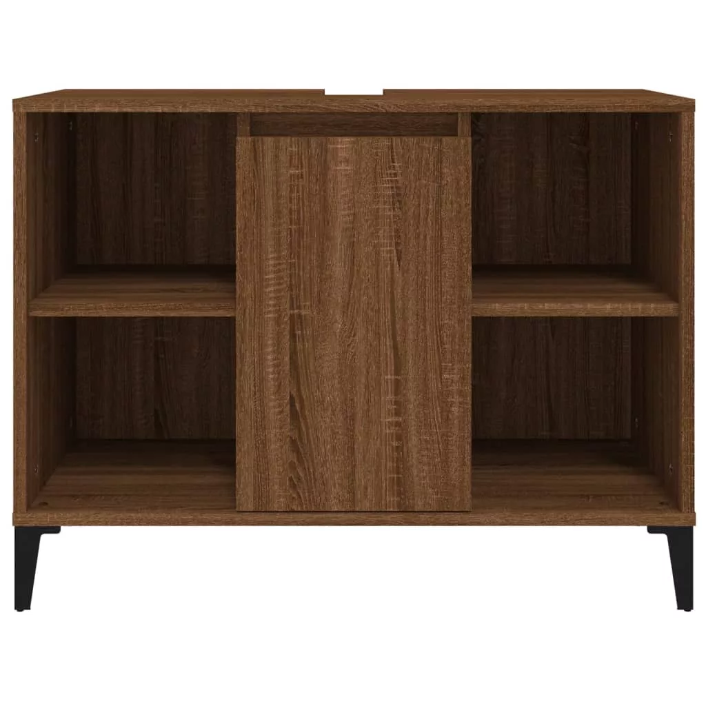 Ez a mosdószekrény fürdőszobája nagyszerű kiegészítője lesz, rendezett és lenyűgöző megjelenést kölcsönözve neki! Tartós anyag: A szerelt fa kivételes minőségű, sima felületű, szilárd, stabil, és ellenáll a nedvességnek.Bőséges tárolóhely: A fürdőszobai mosdószekrény 5 rekesszel és egy ajtóval rendelkezik, amelyek különféle tárolási lehetőségeket és extra helyet kínálnak a fürdőszobában lévő tárgyak tárolására. A fürdőszobaszekrény teteje ideális a mosdókagyló elhelyezésére.Fémlábak: A fémlábak modern és nyugodt stílust kölcsönöznek a belső térnek, miközben stabilitást biztosítanak.Könnyen tisztítható felület: A fürdőszobabútor nedves ruhával könnyen tisztítható. Figyelem:A felborulás elkerülése érdekében ezt a terméket a mellékelt fali rögzítőeszközzel kell használni. Jó tudni:A szerelés megkönnyítése érdekében minden termék kézikönyvvel együtt kerül kiszállításra.A szállítás a mosdókagylót nem tartalmazza.
