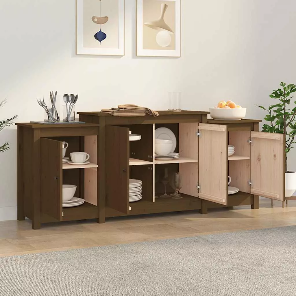 mézbarna tömör fenyőfa tálalószekrény 164x37x68 cm