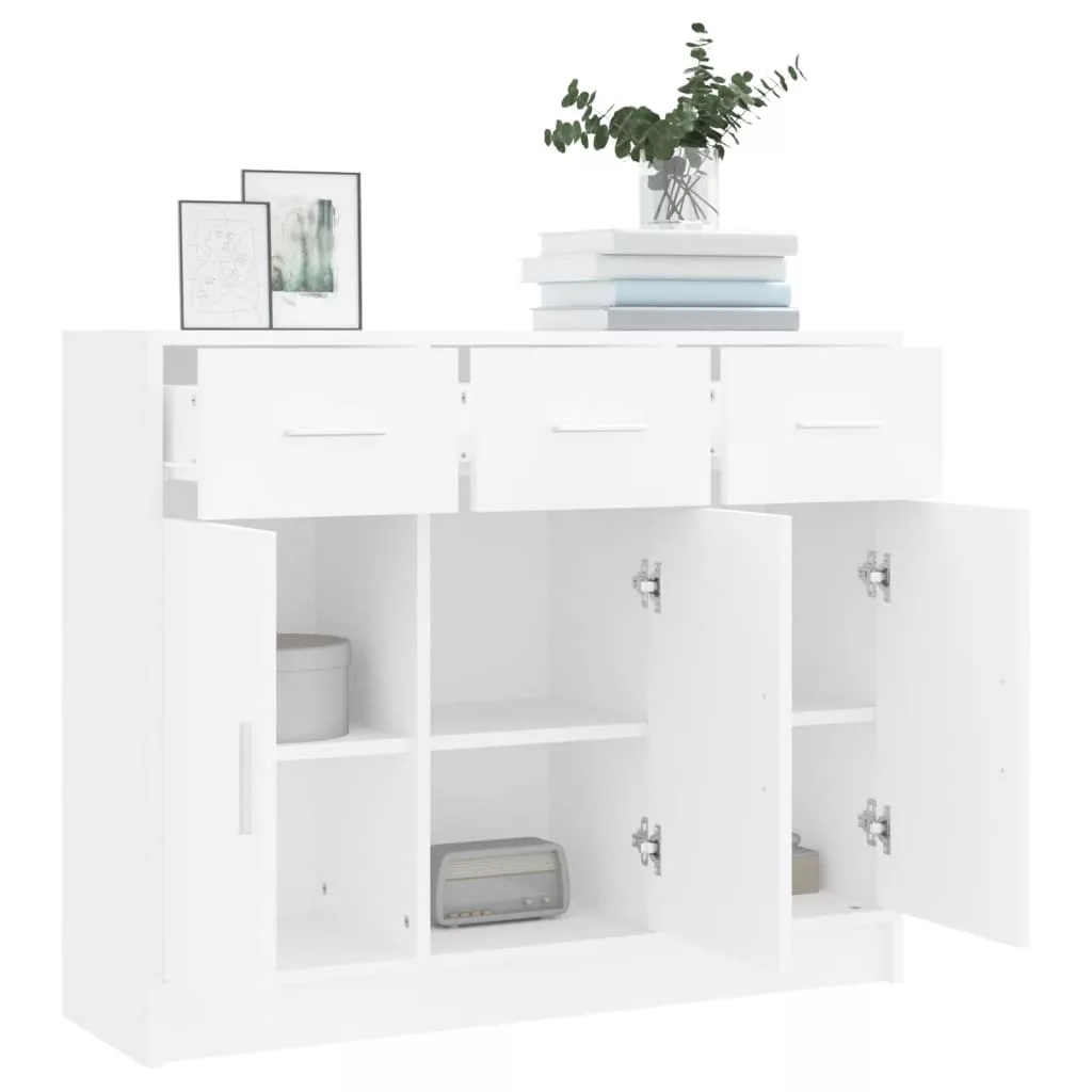 Ez a klasszikus, időtlen megjelenésű tálalószekrény otthona nagyszerű kiegészítője lesz. Tartós anyag: A szerelt fa kivételes minőségű, sima felületű, szilárd, stabil, és ellenáll a nedvességnek. A szerelt fából készült tárolószekrény nedves ruhával könnyen tisztítható.Bőséges tárolóhely: A szekrény bőséges helyet biztosít alapvető holmijai kézközelben történő rendezett tárolásához.Bemutató funkció: A komód teteje tökéletes dísztárgyak, fotóalbumok vagy kis növények elhelyezésére.Praktikus ajtók: Tartsa pormentesen legfontosabb dolgait az ajtók mögé rejtve. Figyelem:A felborulás elkerülése érdekében ezt a terméket a mellékelt fali rögzítőeszközzel kell használni.