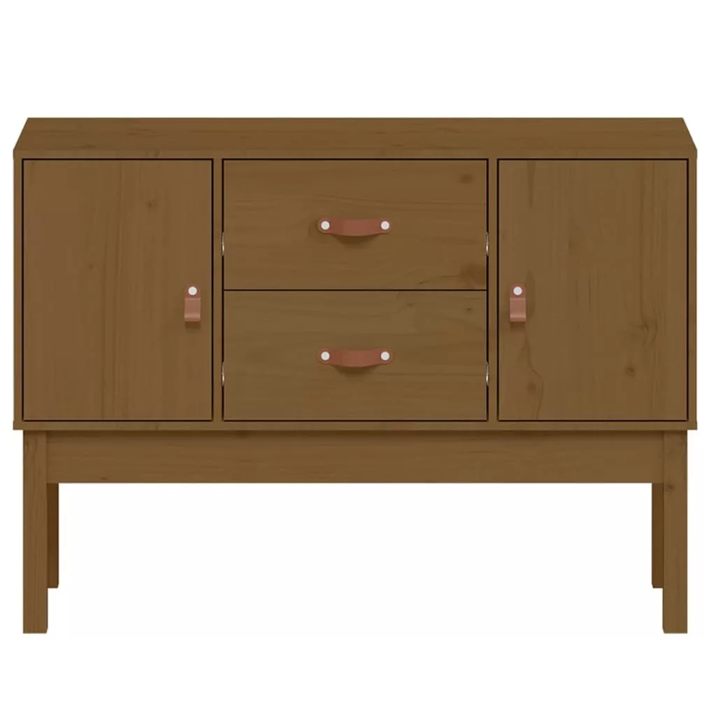 Ez a klasszikus, időtlen megjelenésű tálalószekrény otthona nagyszerű kiegészítője lesz. Tömör fenyőfa: A tömör fenyőfa egy gyönyörű természetes anyag. A fenyőfa erezete egyenes, a csomók pedig jellegzetes, rusztikus megjelenést kölcsönöznek az anyagnak.Bőséges tárolóhely: A kisszekrény 2 fiókkal és 2 rekesszel rendelkezik, amelyek bőséges tárolóhelyet biztosítanak alapvető kellékei kézközelben történő rendezett tárolásához.Masszív felső lap: A szekrény felső lapján elhelyezheti kedvenc fényképeit, dísztárgyait vagy virágokat a szoba dekorációjának gazdagítása érdekében.Praktikus ajtók: A tálalószekrény ajtókkal lett felszerelve, amelyek megvédik holmijait a portól és a szennyeződésektől.Falábak: A tárolószekrény falábak természetes és kellemes megjelenést kölcsönöznek a lámpaasztalnak, és a stabilitást is biztosítják. Bármilyen környezetbe illeni fog. Figyelem:A dőlés megakadályozása érdekében a terméket a mellékelt tartóelem segítségével rögzíteni kell a falhoz. Megjegyzés:Az egyszerű összeszerelés érdekében minden termékhez mellékelünk összeszerelési útmutatót.