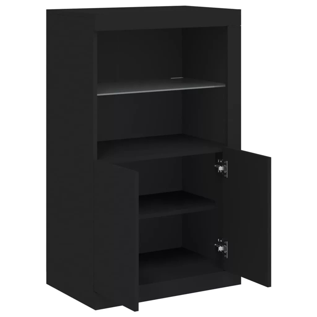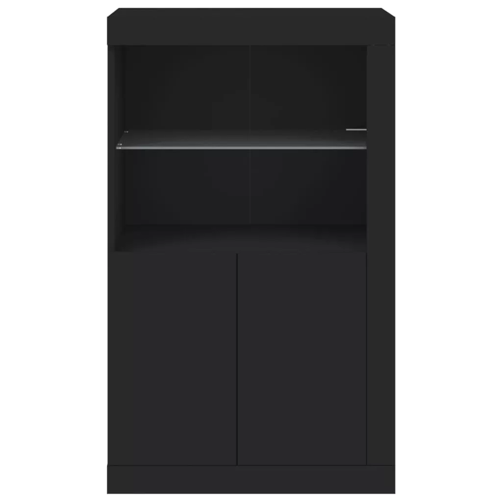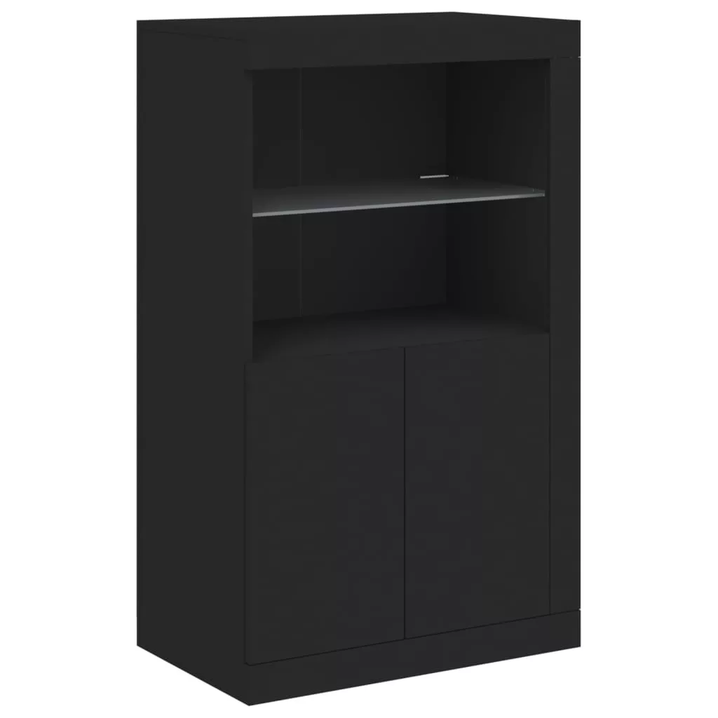 fekete szerelt fa tálalószekrény LED-világítással