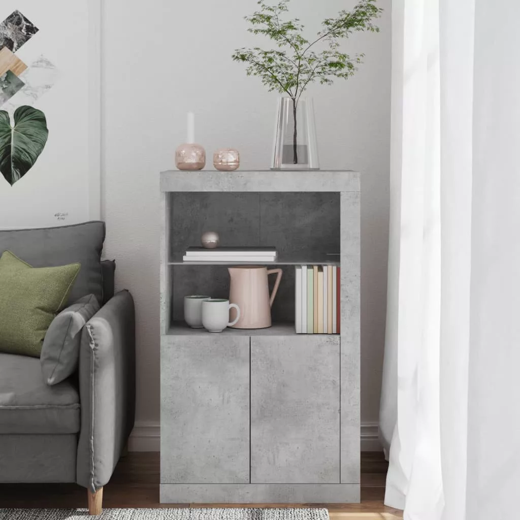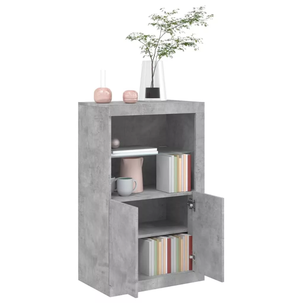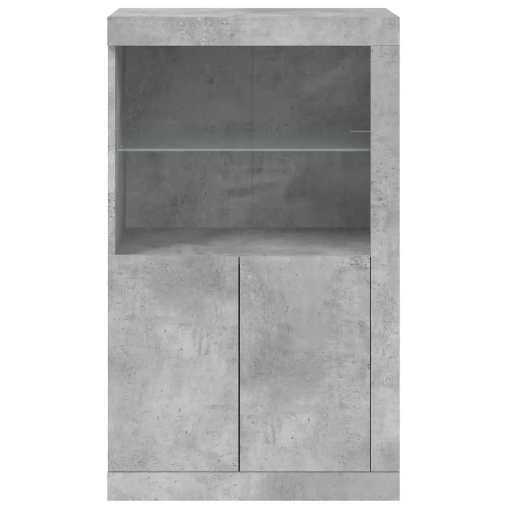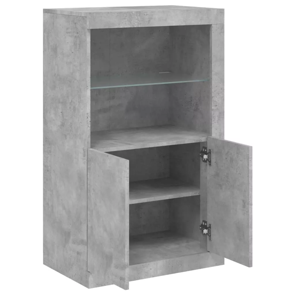 betonszürke szerelt fa tálalószekrény LED-világítással