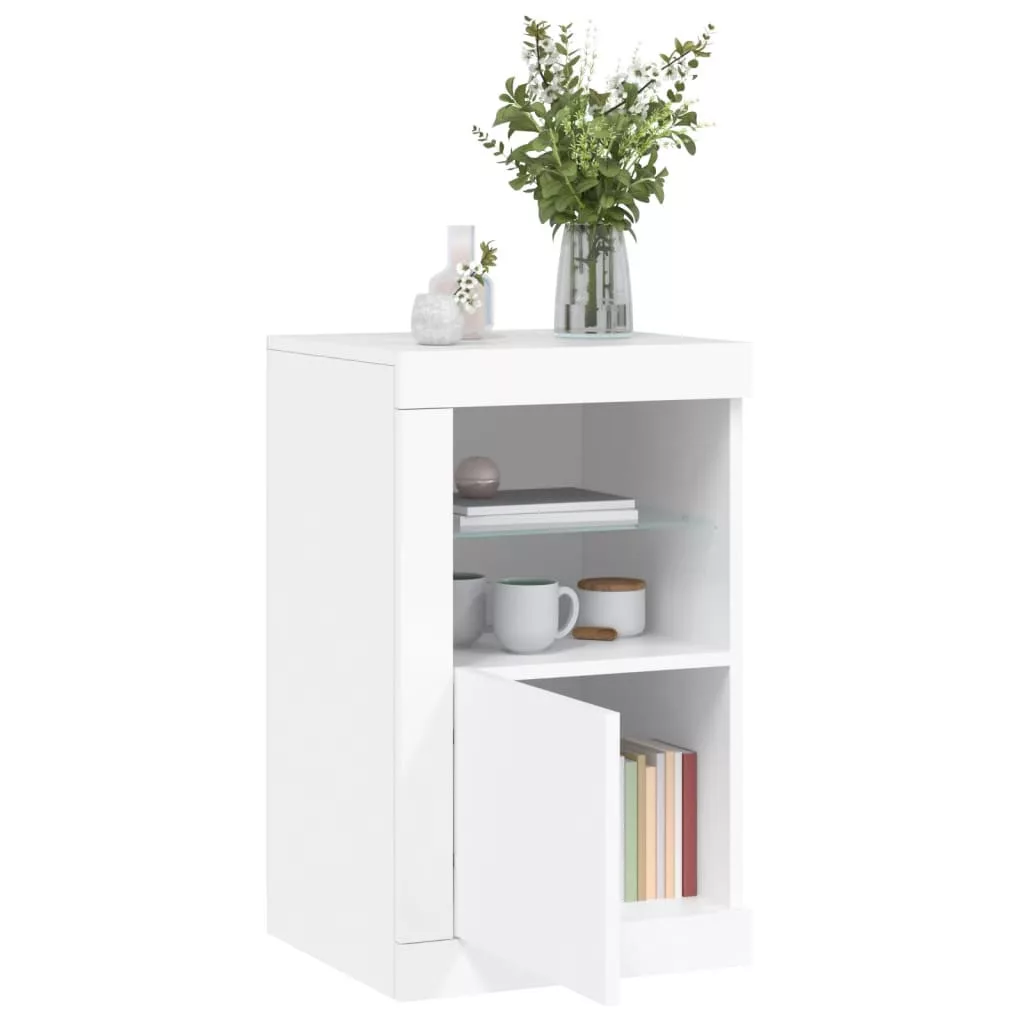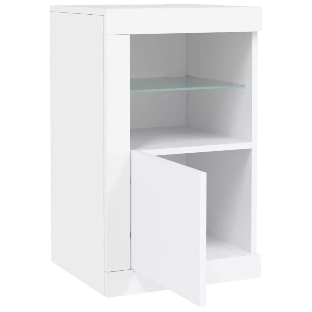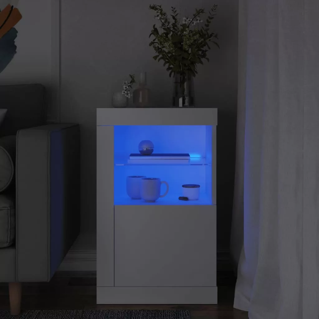 Ez a divatos, mégis praktikus kialakítású, LED-világítással ellátott tálalószekrény garantáltan a helyiség fénypontja lesz. Tartós anyag: A szerelt fa kivételes minőségű, sima felületű, szilárd, stabil, és ellenáll a nedvességnek.RGB LED-világítás: A szekrény élénk RGB LED-világítással van felszerelve. A sokféle testre szabható menü segítségével egyszerűen megváltoztathatja a világítás színét, sőt, automatikus váltakozást is beállíthat. Ezek a LED-lámpák nemcsak a szekrény modern megjelenését, de divatosságát is növelik.Bőséges tárolóhely: A tárolószekrény üvegpolccal és az ajtaja mögött rejtett tárolórésszel rendelkezik, így rengeteg helyet biztosít mindennapi holmijai kézközelben történő rendezett tárolására.Rugalmas ajtó telepítés: Az ajtót saját igényei szerint bal vagy jobb oldalra is beépítheti. Jó tudni:A termék USB-csatlakozóval rendelkezik, amelyhez hitelesített, 5 V-os USB áramforrás szükséges (nem alaptartozék). Figyelem:A dőlés megakadályozása érdekében a terméket a mellékelt tartóelem segítségével rögzíteni kell a falhoz. Ne használja ezt az elemet, ha valamelyik alkatrésze eltört, elszakadt vagy hiányzik. Ez a termék DC 5V-ról működik, de a tanúsított 5V-os USB-tápforrást nem tartalmazza. A magasabb feszültség túlmelegedést okozhat, ami a készülék károsodását, valamint a túlmelegedés és a tűz esetleges kockázatát okozhatja.