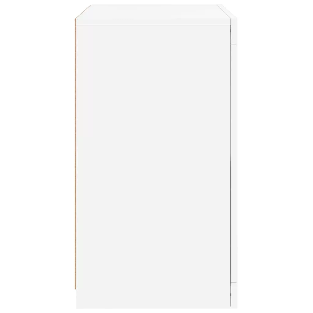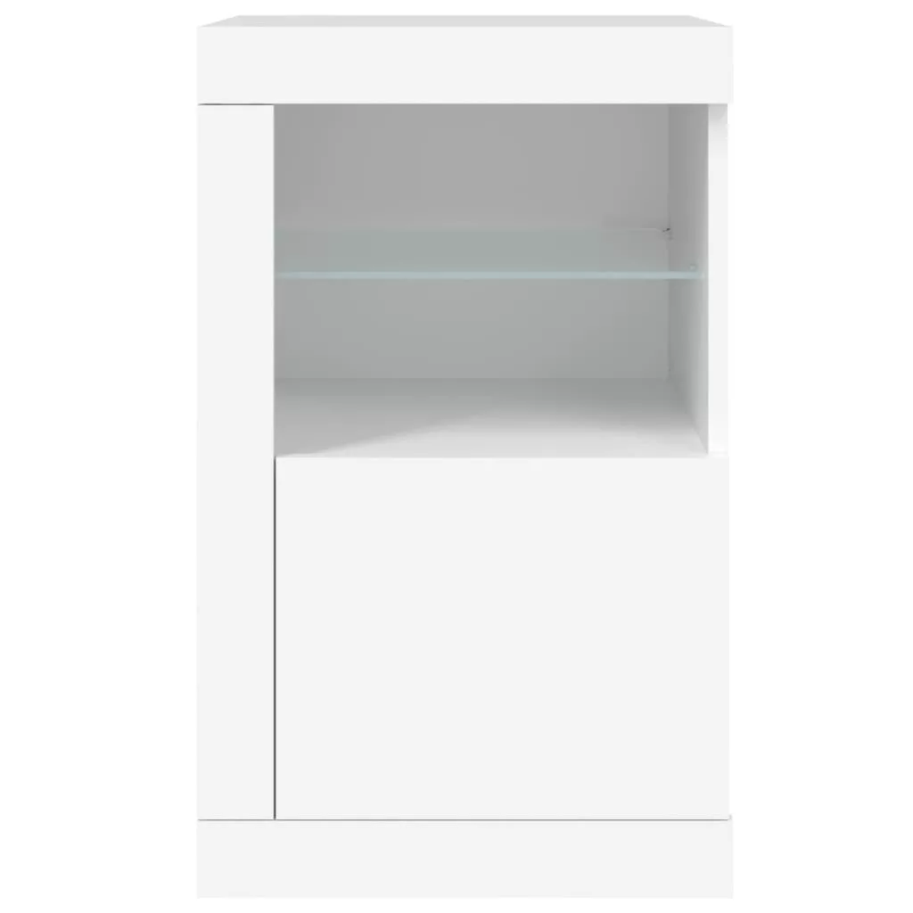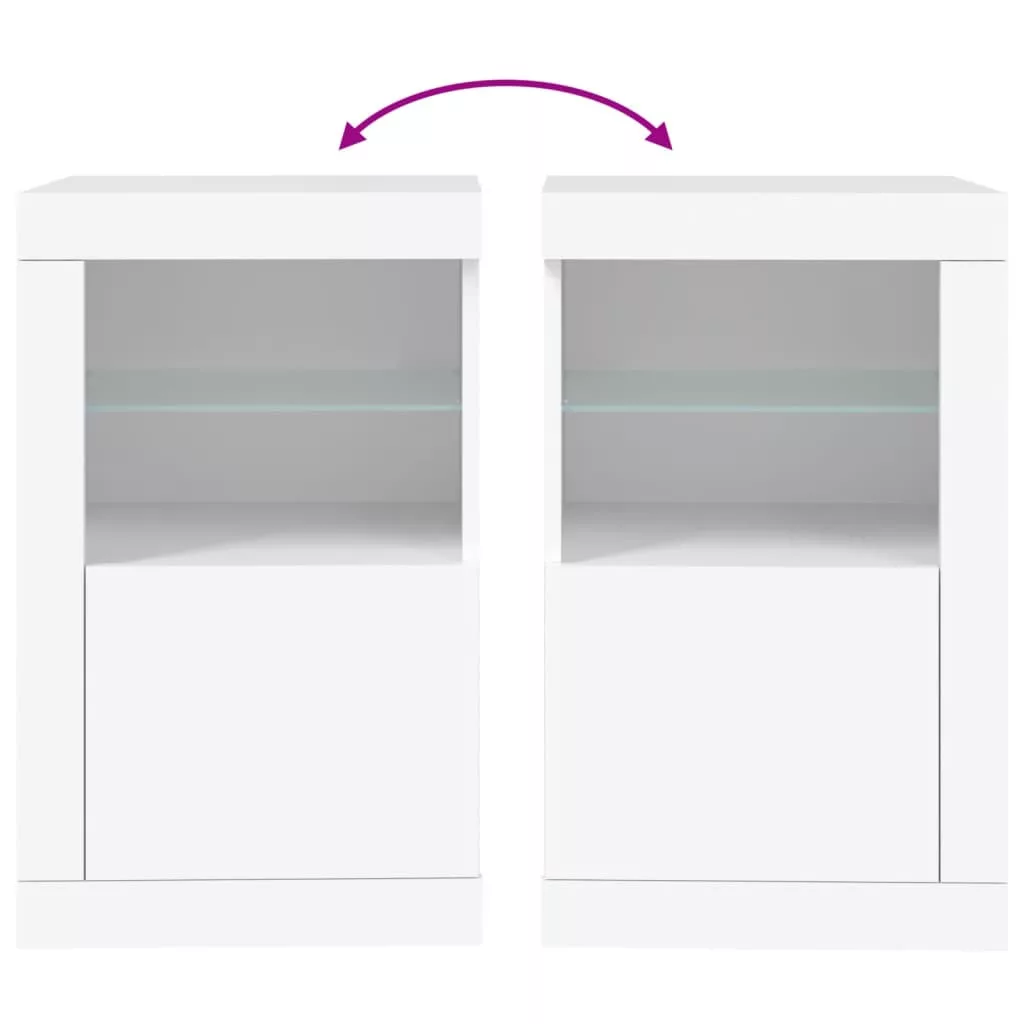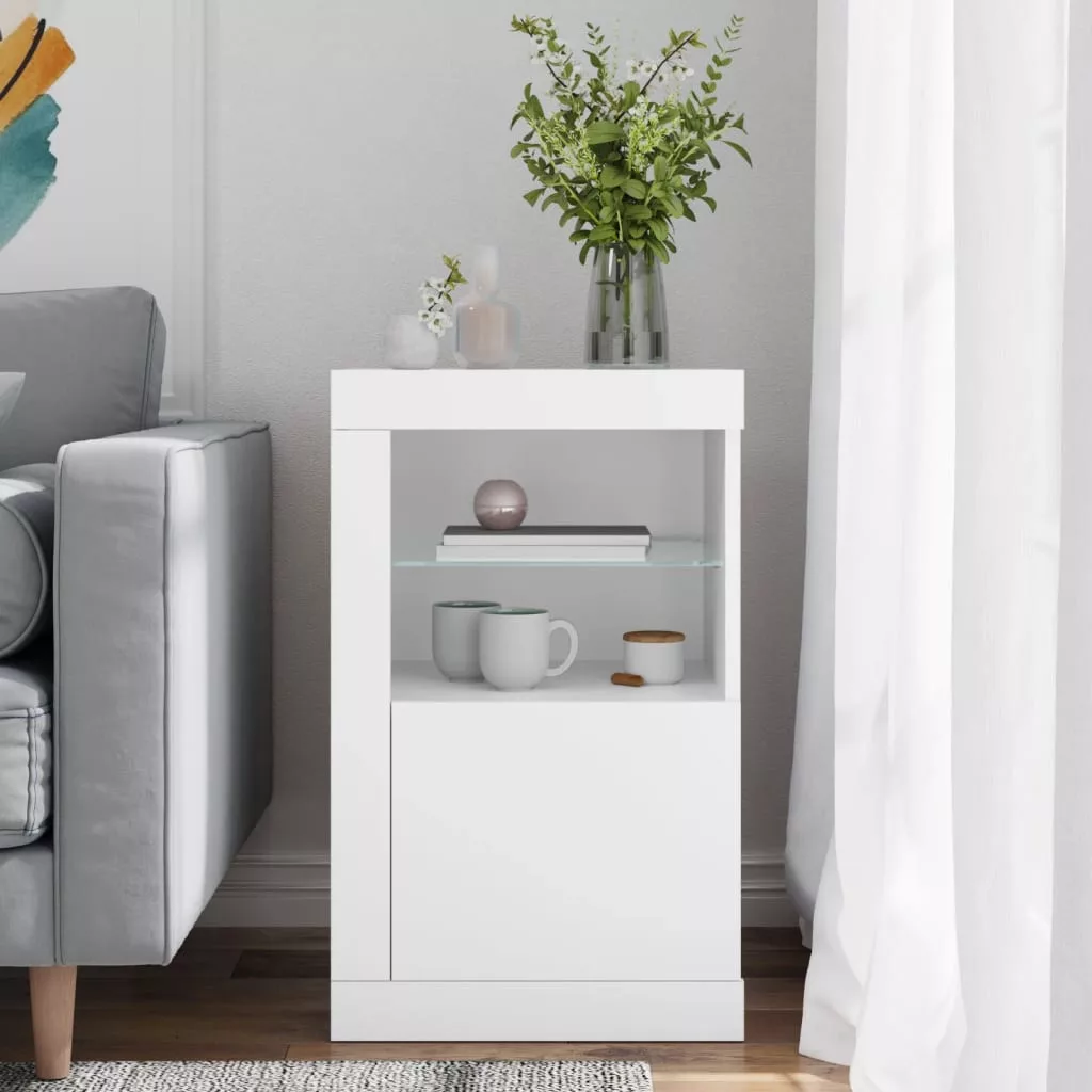 Ez a divatos, mégis praktikus kialakítású, LED-világítással ellátott tálalószekrény garantáltan a helyiség fénypontja lesz. Tartós anyag: A szerelt fa kivételes minőségű, sima felületű, szilárd, stabil, és ellenáll a nedvességnek.RGB LED-világítás: A szekrény élénk RGB LED-világítással van felszerelve. A sokféle testre szabható menü segítségével egyszerűen megváltoztathatja a világítás színét, sőt, automatikus váltakozást is beállíthat. Ezek a LED-lámpák nemcsak a szekrény modern megjelenését, de divatosságát is növelik.Bőséges tárolóhely: A tárolószekrény üvegpolccal és az ajtaja mögött rejtett tárolórésszel rendelkezik, így rengeteg helyet biztosít mindennapi holmijai kézközelben történő rendezett tárolására.Rugalmas ajtó telepítés: Az ajtót saját igényei szerint bal vagy jobb oldalra is beépítheti. Jó tudni:A termék USB-csatlakozóval rendelkezik, amelyhez hitelesített, 5 V-os USB áramforrás szükséges (nem alaptartozék). Figyelem:A dőlés megakadályozása érdekében a terméket a mellékelt tartóelem segítségével rögzíteni kell a falhoz. Ne használja ezt az elemet, ha valamelyik alkatrésze eltört, elszakadt vagy hiányzik. Ez a termék DC 5V-ról működik, de a tanúsított 5V-os USB-tápforrást nem tartalmazza. A magasabb feszültség túlmelegedést okozhat, ami a készülék károsodását, valamint a túlmelegedés és a tűz esetleges kockázatát okozhatja.