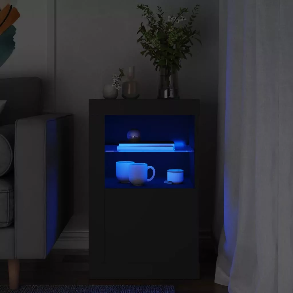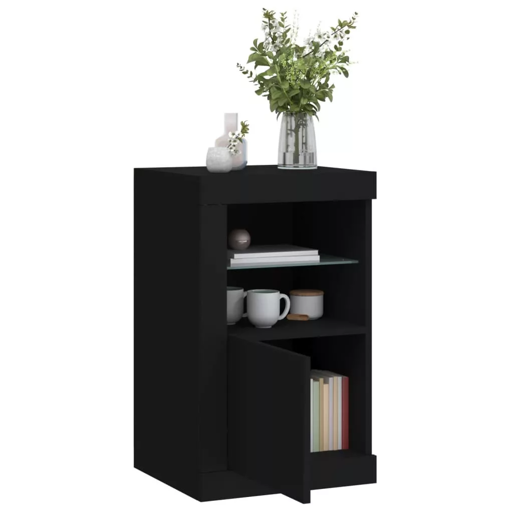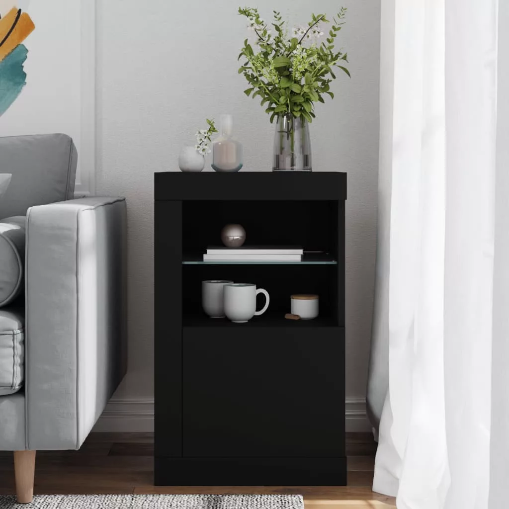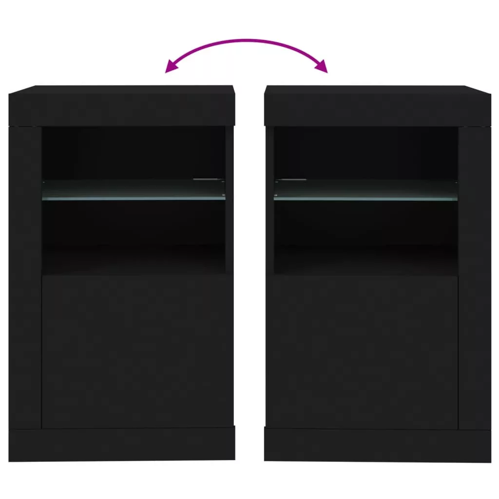 fekete szerelt fa tálalószekrény LED-világítással