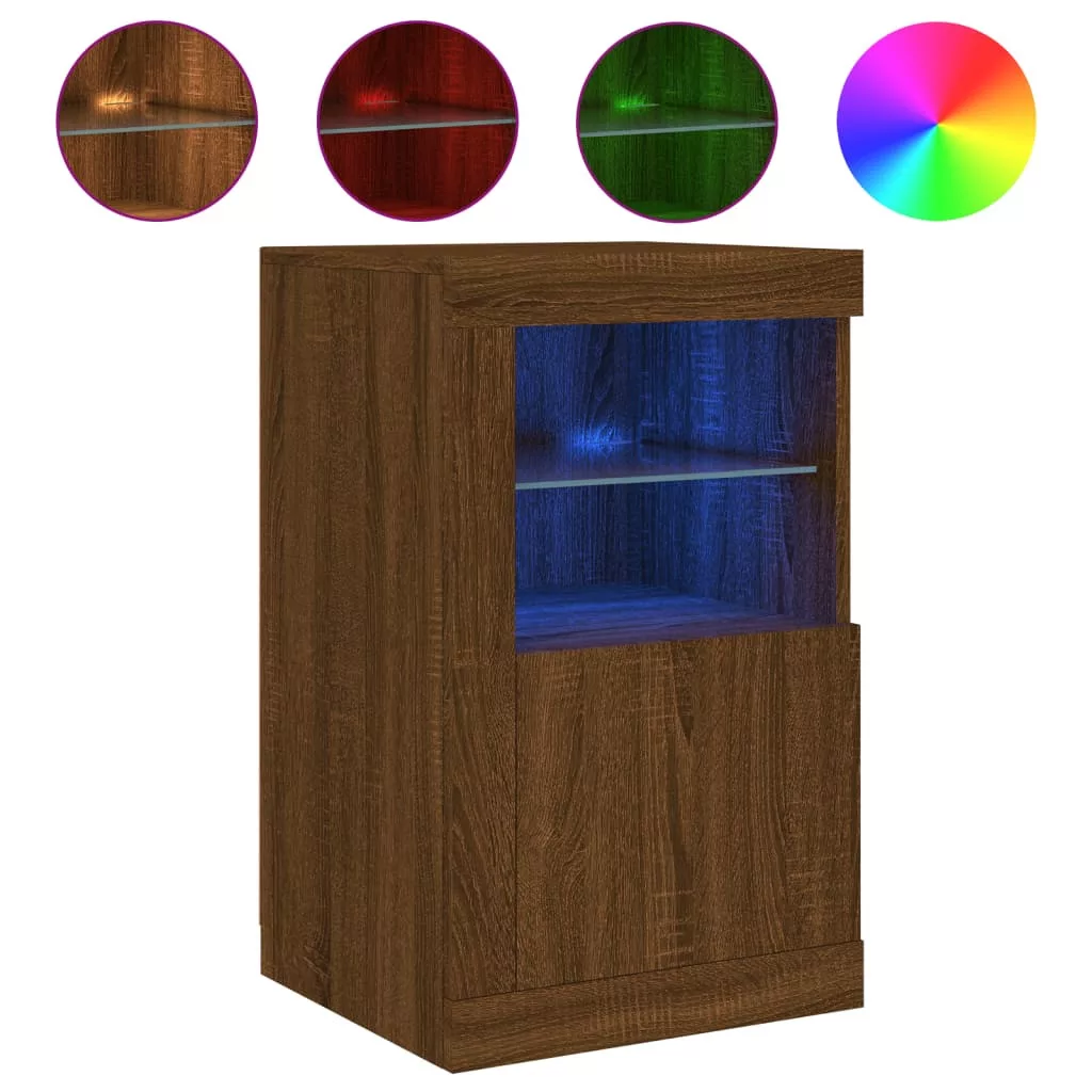 Ez a divatos, mégis praktikus kialakítású, LED-világítással ellátott tálalószekrény garantáltan a helyiség fénypontja lesz. Tartós anyag: A szerelt fa kivételes minőségű, sima felületű, szilárd, stabil, és ellenáll a nedvességnek.RGB LED-világítás: A szekrény élénk RGB LED-világítással van felszerelve. A sokféle testre szabható menü segítségével egyszerűen megváltoztathatja a világítás színét, sőt, automatikus váltakozást is beállíthat. Ezek a LED-lámpák nemcsak a szekrény modern megjelenését, de divatosságát is növelik.Bőséges tárolóhely: A tárolószekrény üvegpolccal és az ajtaja mögött rejtett tárolórésszel rendelkezik, így rengeteg helyet biztosít mindennapi holmijai kézközelben történő rendezett tárolására.Rugalmas ajtó telepítés: Az ajtót saját igényei szerint bal vagy jobb oldalra is beépítheti. Jó tudni:A termék USB-csatlakozóval rendelkezik, amelyhez hitelesített, 5 V-os USB áramforrás szükséges (nem alaptartozék). Figyelem:A dőlés megakadályozása érdekében a terméket a mellékelt tartóelem segítségével rögzíteni kell a falhoz. Ne használja ezt az elemet, ha valamelyik alkatrésze eltört, elszakadt vagy hiányzik. Ez a termék DC 5V-ról működik, de a tanúsított 5V-os USB-tápforrást nem tartalmazza. A magasabb feszültség túlmelegedést okozhat, ami a készülék károsodását, valamint a túlmelegedés és a tűz esetleges kockázatát okozhatja.