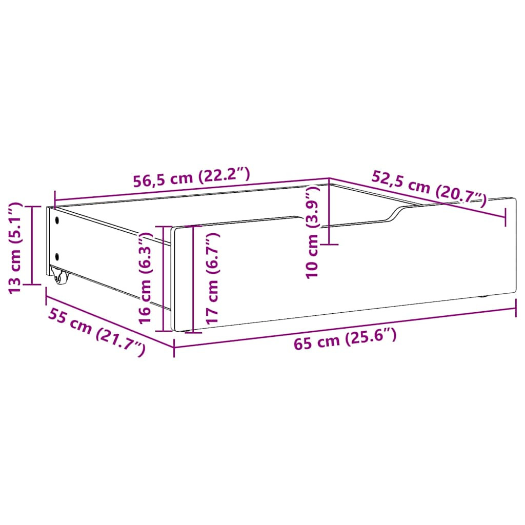 2 db tömör fenyőfa ágy alatti fiók kerekekkel 65 x 55 x 17 cm