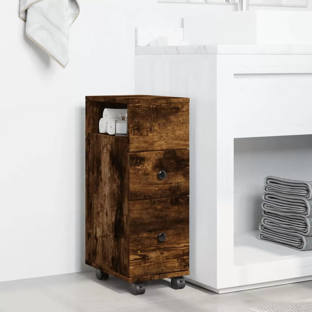 füstös tölgy színű szerelt fa görgős keskeny fürdőszobaszekrény