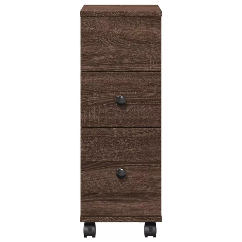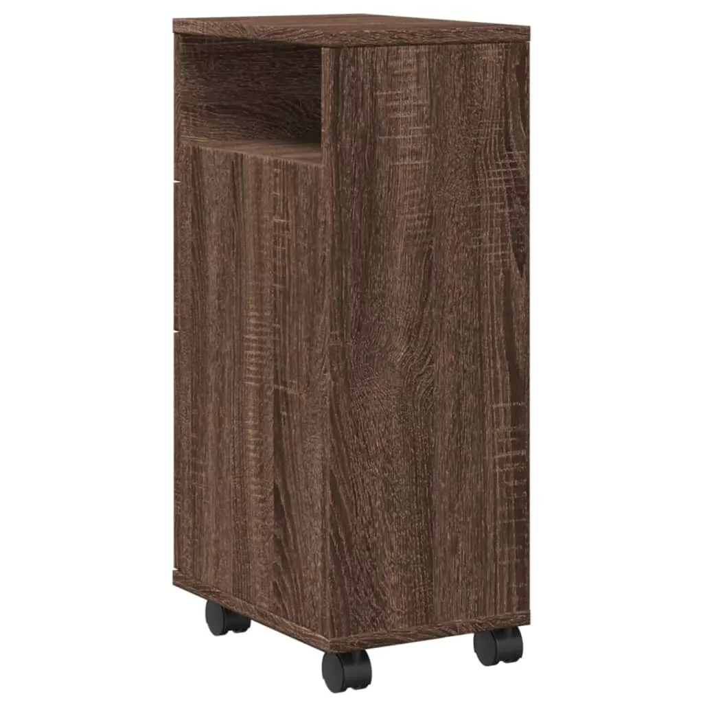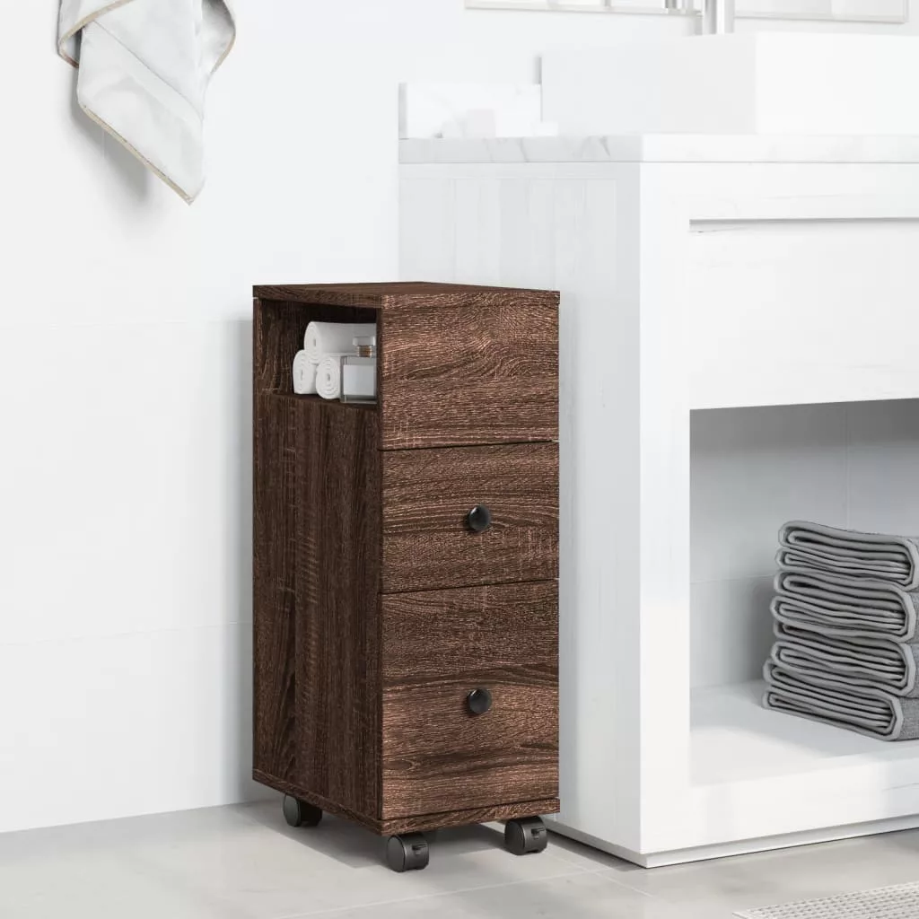 barna tölgy színű szerelt fa görgős keskeny fürdőszobaszekrény