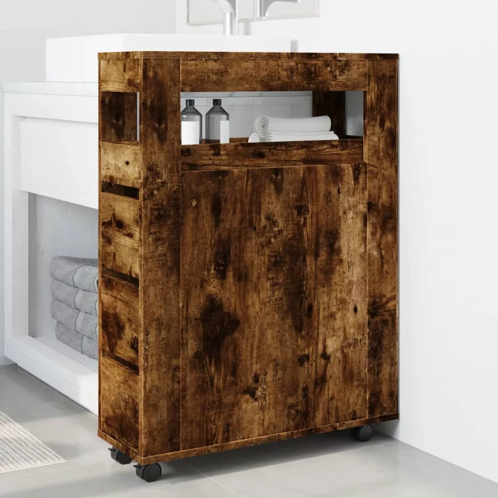 füstös tölgy színű szerelt fa görgős keskeny fürdőszobaszekrény