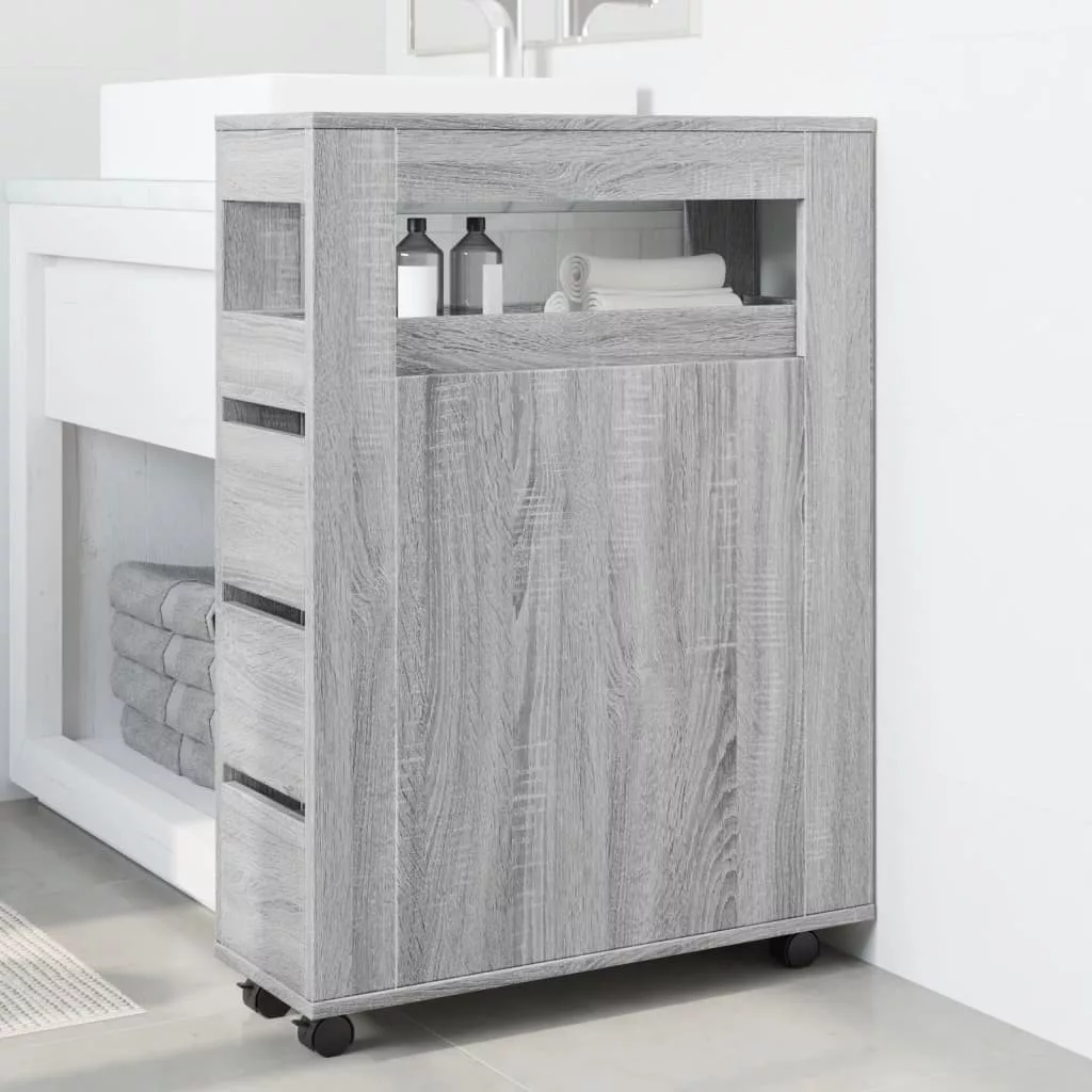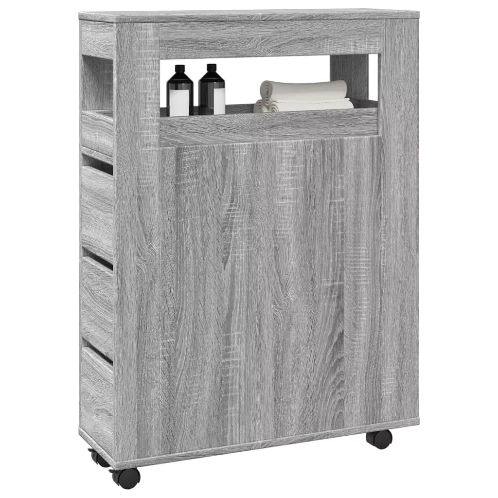 szürke sonoma szerelt fa görgős keskeny fürdőszobaszekrény