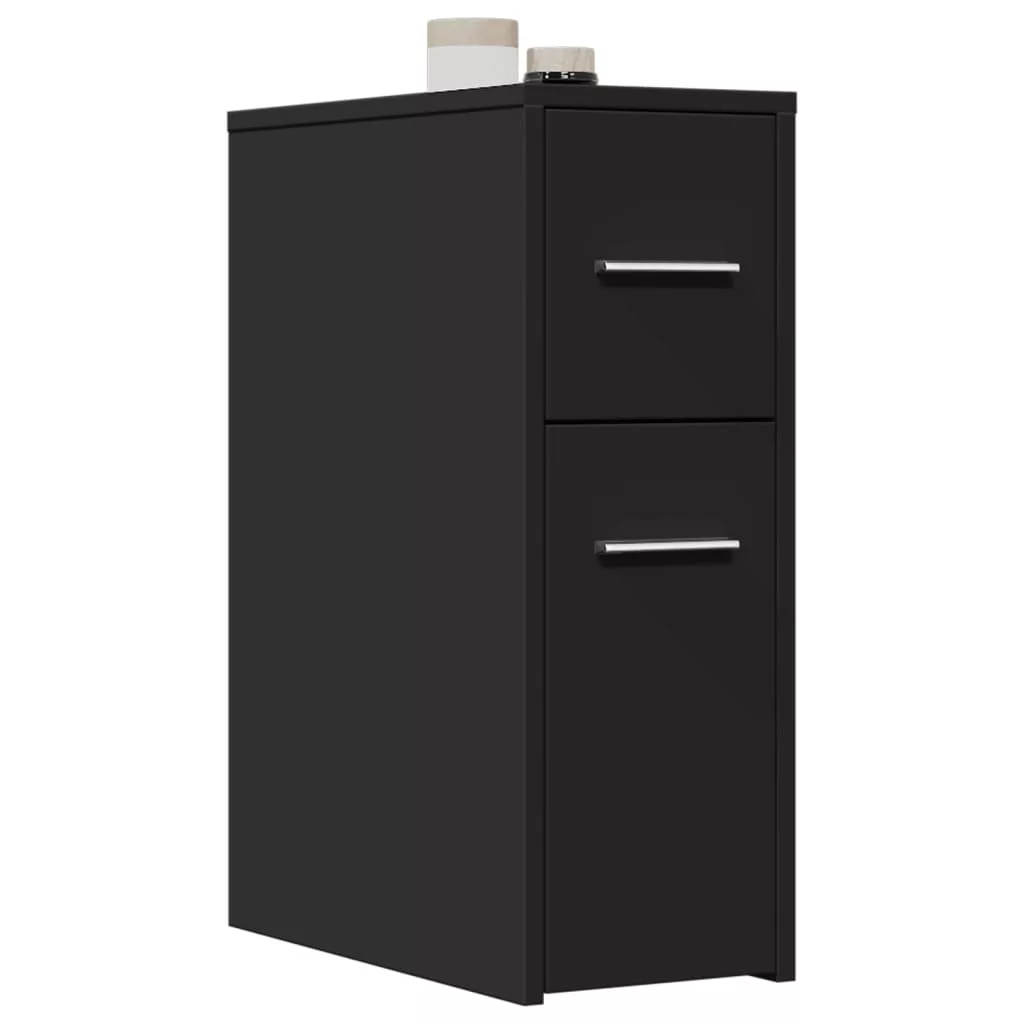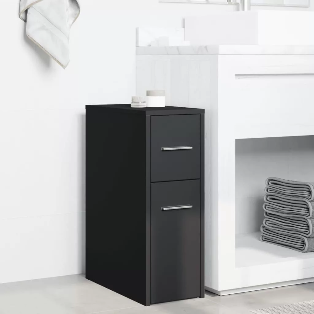 fekete szerelt fa keskeny fürdőszobaszekrény kerekekkel