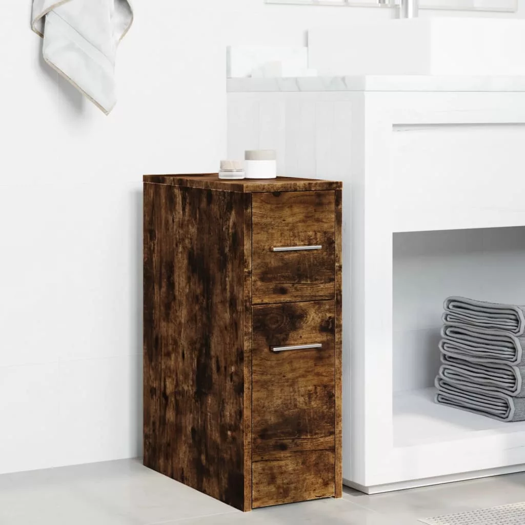 füstös tölgy színű szerelt fa görgős keskeny fürdőszobaszekrény
