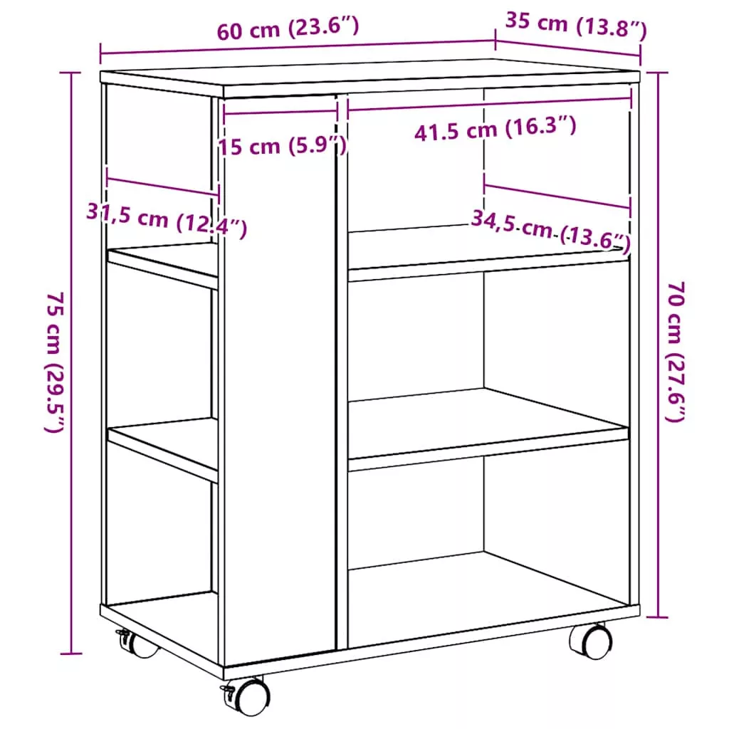 Ez a gördülő szekrény könnyen mozgatható, és bőséges helyet kínál, így kényelmes és megkönnyíti a munkavégzést. Stabil és tartós anyag: A szerelt fa tartós és stabil anyag sima felülettel, amely ellenáll a nedvességnek, a vetemedésnek és a hasadásnak, így megbízható választás különféle célokhoz.Bőséges tárolóhely: A polcokkal ellátott tárolószekrény bőséges tárolóhelyet kínál, hogy az alapvető dolgok jól rendszerezve és elérhető közelségben legyenek.Könnyen mozgatható: Ez a mobil irattartó szekrény a mellékelt négy forgókeréknek köszönhetően könnyen áthelyezhető a kívánt helyre. A kerekek közül kettő lezárható, így a szekrény stabilan a helyén marad.Megjelenítő funkció: Az irattartó szekrény teteje stabil felületet biztosít, ahol elhelyezheti italait, könyveit vagy akár dísztárgyait.Széleskörű felhasználás: Ez az időtlen stílusú, guruló tárolószekrény saját igényei szerint használható a nappaliban, a konyhában, vagy a hálószobában.